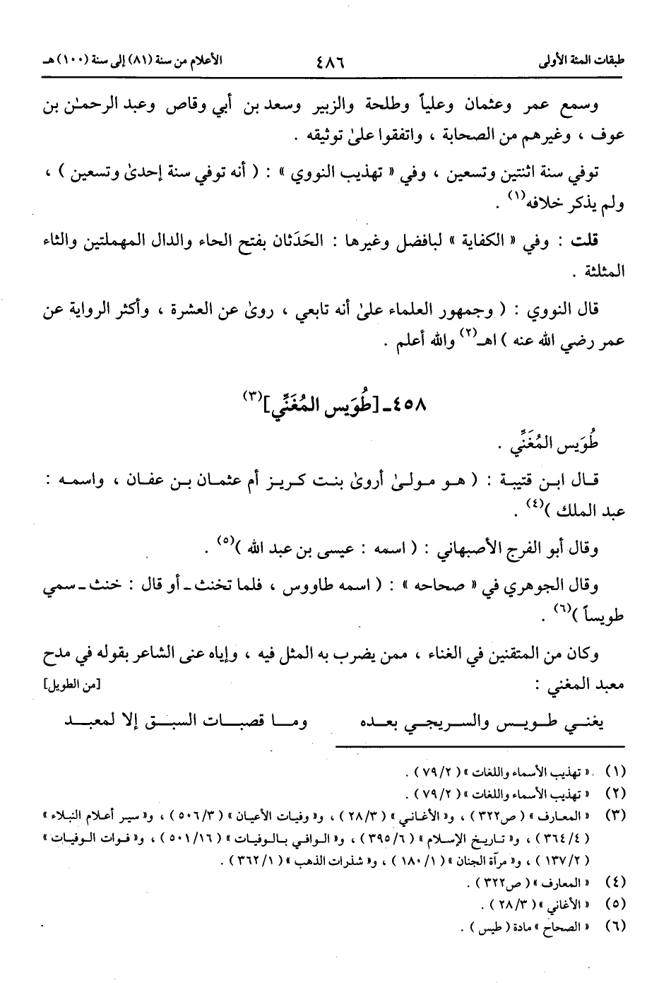 (3) «المعارف» (ص 322)، و «الأغاني» (3/ 28)، و «وفيات الأعيان» (3/ 506)، و «سير أعلام النبلاء» (4/ 364)، و «تاريخ الإسلام» (6/ 395)، و «الوافي بالوفيات» (16/ 501)، و «فوات الوفيات» (2/ 137)، و «مرآة الجنان» (1/ 180)، و «شذرات الذهب» (1/ 362).