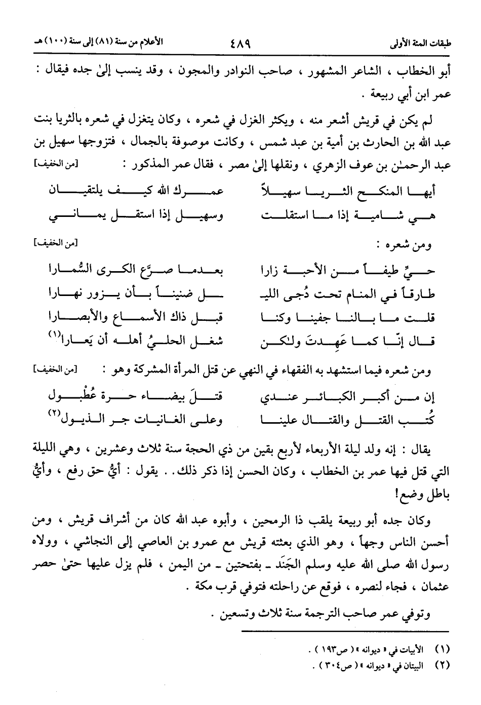 لم يكن في قريش أشعر منه، ويكثر الغزل في شعره، وكان يتغزل في شعره بالثريا بنت عبد الله بن الحارث بن أمية بن عبد شمس، وكانت موصوفة بالجمال، فتزوجها سهيل بن عبد الرحمن بن عوف الزهري، ونقلها إلى مصر، فقال عمر المذكور: [من الخفيف]