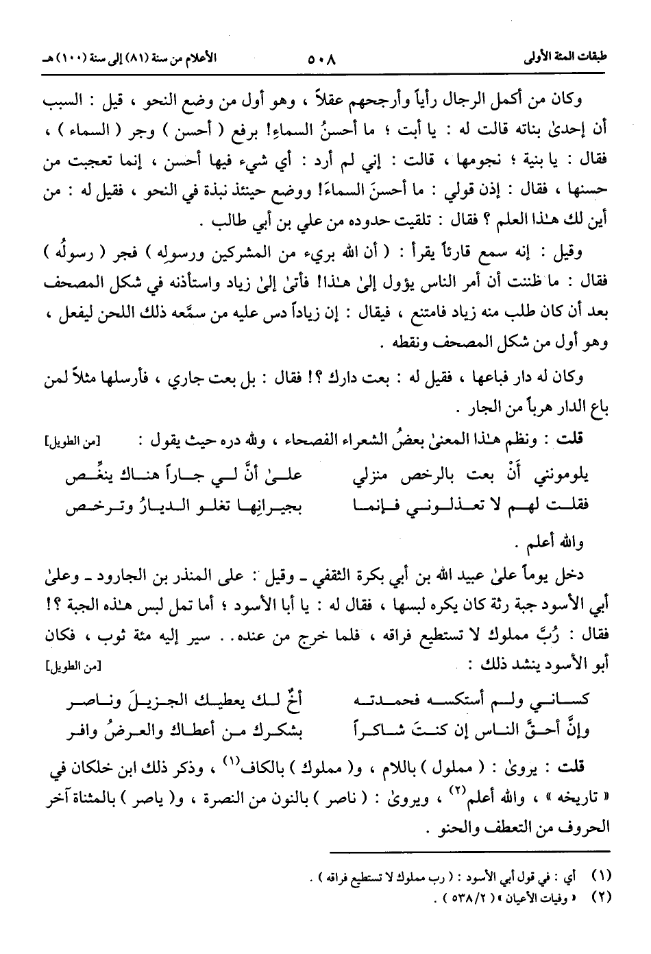 وكان من أكمل الرجال رأيا وأرجحهم عقلا، وهو أول من وضع النحو، قيل: السبب أن إحدى بناته قالت له: يا أبت؛ ما أحسن السماء! برفع (أحسن) وجر (السماء)، فقال: يا بنية؛ نجومها، قالت: إني لم أرد: أي شيء فيها أحسن، إنما تعجبت من حسنها، فقال: إذن قولي: ما أحسن السماء! ووضع حينئذ نبذة في النحو، فقيل له: من أين لك هذا العلم؟ فقال: تلقيت حدوده من علي بن أبي طالب.