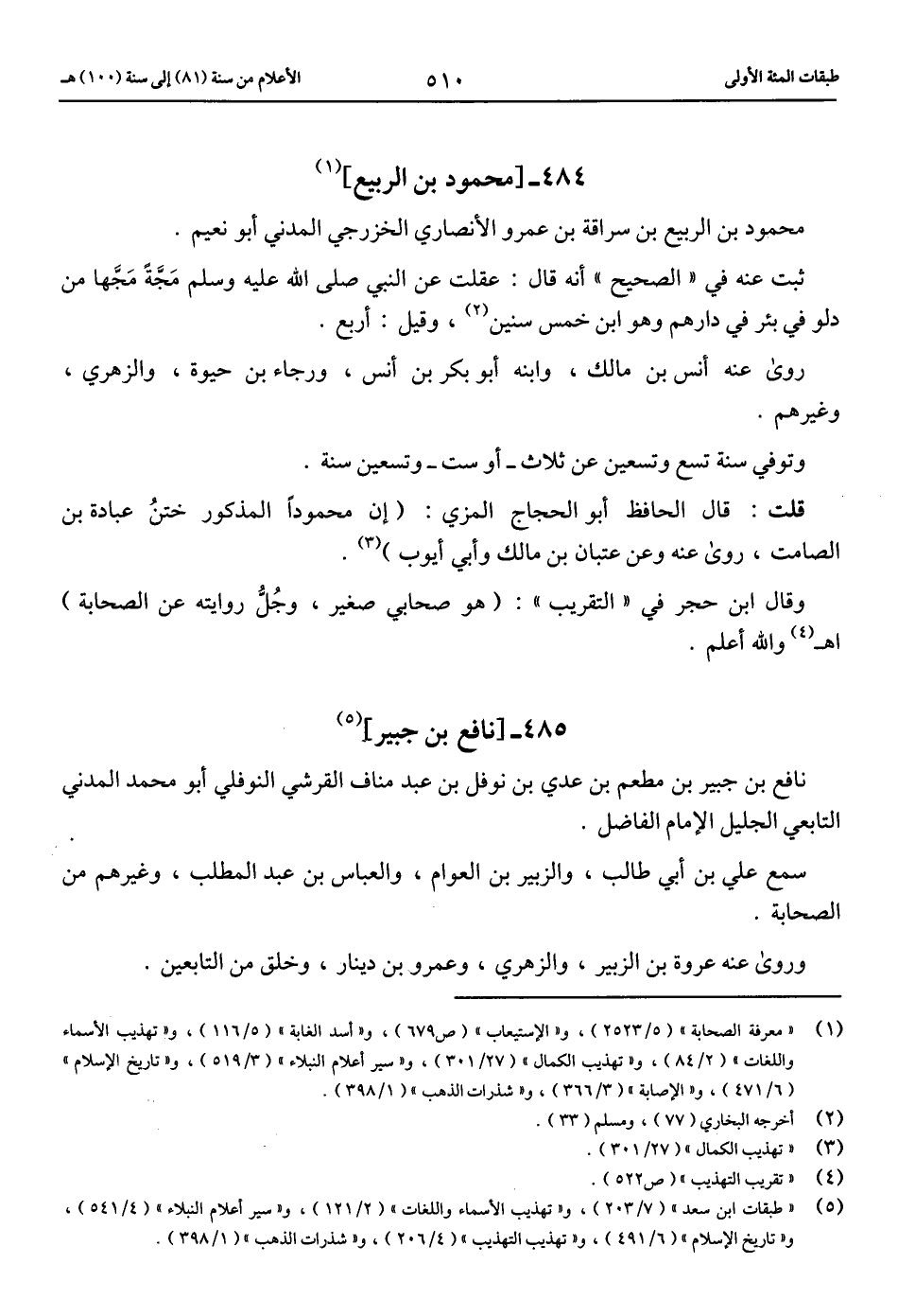 (5) «طبقات ابن سعد» (7/ 203)، و «تهذيب الأسماء واللغات» (2/ 121)، و «سير أعلام النبلاء» (4/ 541)، و «تاريخ الإسلام» (6/ 491)، و «تهذيب التهذيب» (4/ 206)، و «شذرات الذهب» (1/ 398).