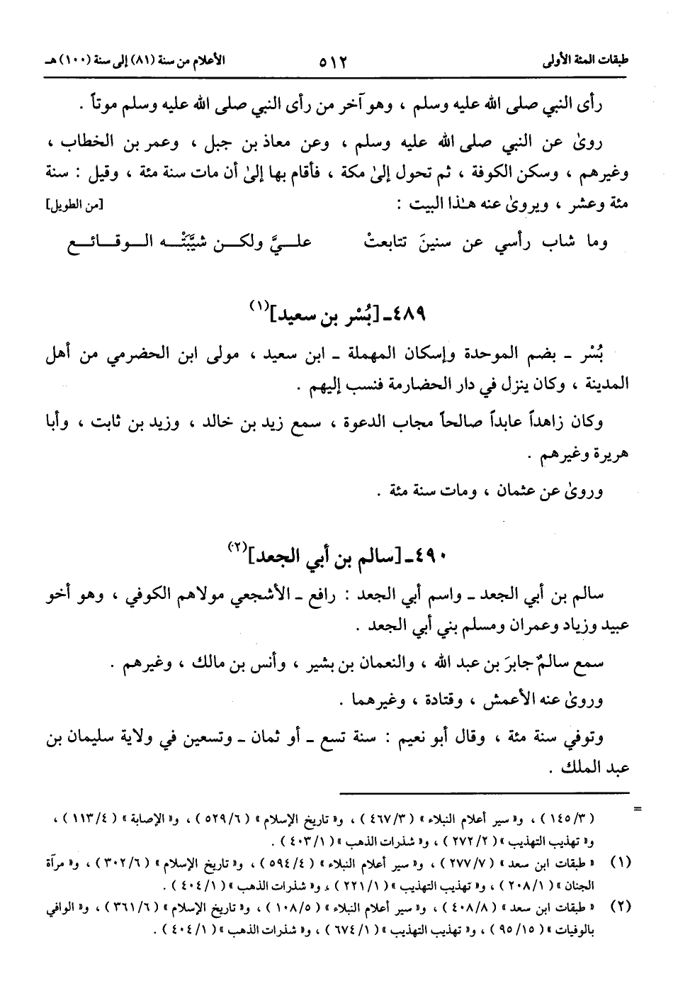 (2) «طبقات ابن سعد» (8/ 408)، و «سير أعلام النبلاء» (5/ 108)، و «تاريخ الإسلام» (6/ 361)، و «الوافي بالوفيات» (15/ 95)، و «تهذيب التهذيب» (1/ 674)، و «شذرات الذهب» (1/ 404).