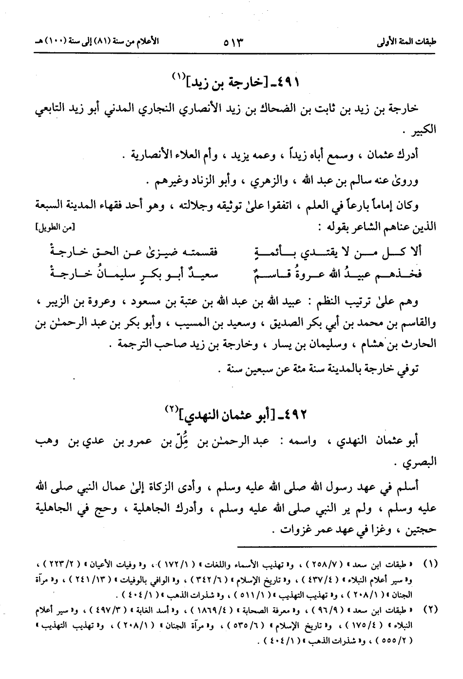 (2) «طبقات ابن سعد» (9/ 96)، و «معرفة الصحابة» (4/ 1869)، و «أسد الغابة» (3/ 497)، و «سير أعلام النبلاء» (4/ 175)، و «تاريخ الإسلام» (6/ 535)، و «مرآة الجنان» (1/ 208)، و «تهذيب التهذيب» (2/ 555)، و «شذرات الذهب» (1/ 404).