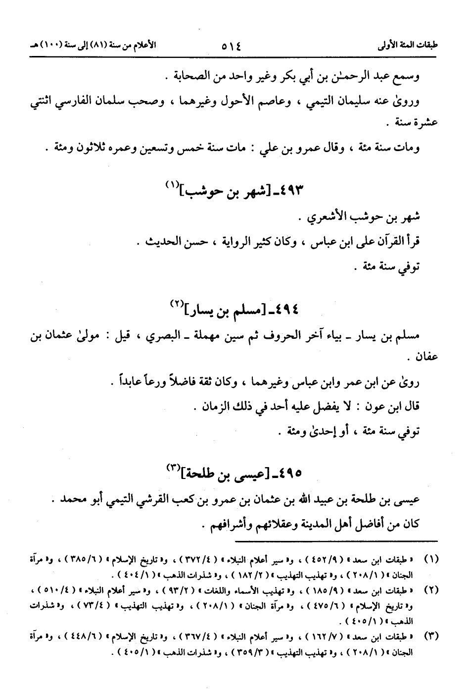 (3) «طبقات ابن سعد» (7/ 162)، و «سير أعلام النبلاء» (4/ 367)، و «تاريخ الإسلام» (6/ 448)، و «مرآة الجنان» (1/ 208)، و «تهذيب التهذيب» (3/ 359)، و «شذرات الذهب» (1/ 405).