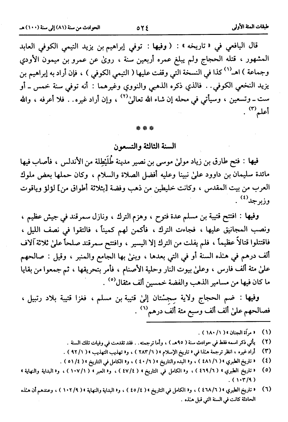 قال اليافعي في «تاريخه»: (وفيها: توفي إبراهيم بن يزيد التيمي الكوفي العابد المشهور، قتله الحجاج ولم يبلغ عمره أربعين سنة، روى عن عمرو بن ميمون الأودي وجماعة) اهـ (1) كذا في النسخة التي وقفت عليها (التيمي الكوفي)، فإن أراد به إبراهيم بن يزيد النخعي الكوفي .. فالذي ذكره الذهبي والنووي وغيرهما: أنه توفي سنة خمس-أو ست-وتسعين، وسيأتي في محله إن شاء الله تعالى (2)، وإن أراد غيره .. فلا أعرفه، والله أعلم (3).