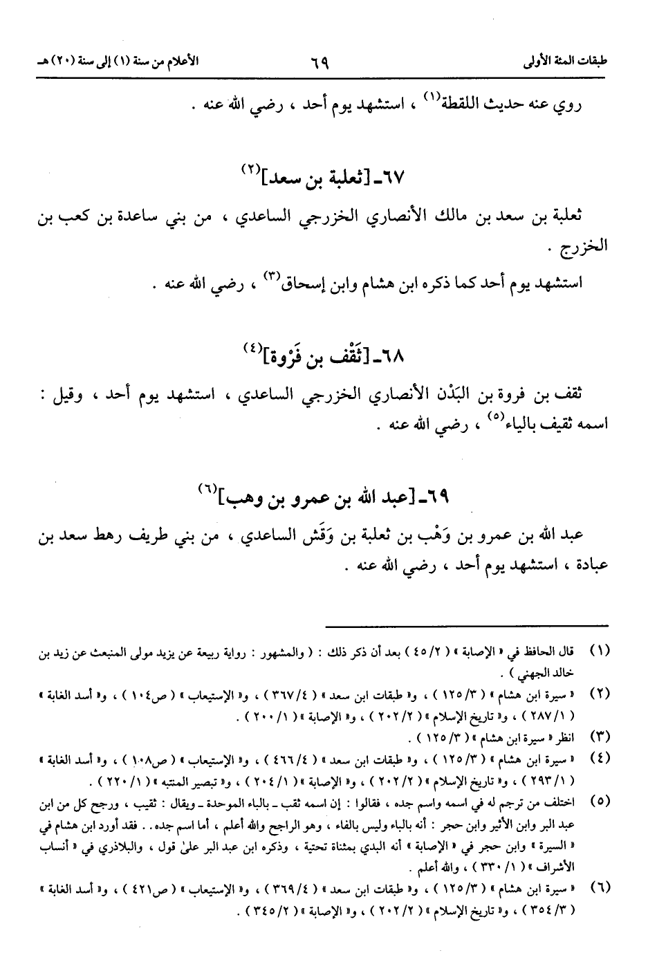 (2) «سيرة ابن هشام» (3/ 125)، و «طبقات ابن سعد» (4/ 367)، و «الاستيعاب» (ص 104)، و «أسد الغابة» (1/ 287)، و «تاريخ الإسلام» (2/ 202)، و «الإصابة» (1/ 200).