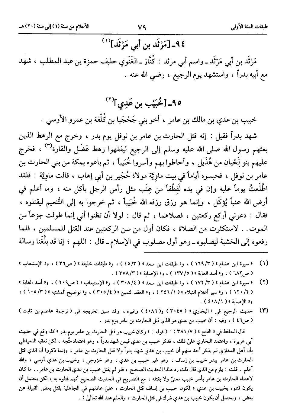 (3) حديث الرجيع في «البخاري» (3045) و (4086) وغيره، وقد سبق تخريجه في (ترجمة عاصم بن ثابت) (ص 46)، وفيه: أن خبيب بن عدي هو الذي قتل الحارث بن عامر يوم بدر. قال الحافظ في «الفتح» (7/ 381): (قوله: «وكان خبيب هو قتل الحارث بن عامر يوم بدر» كذا وقع في حديث أبي هريرة، واعتمد البخاري على ذلك، فذكر خبيب بن عدي فيمن شهد بدرا، وهو اعتماد متّجه، لكن تعقبه الدمياطي بأن أهل المغازي لم يذكر أحد منهم أن خبيب بن عدي شهد بدرا ولا قتل الحارث بن عامر، وإنما ذكروا أن الذي قتل الحارث بن عامر ببدر خبيب بن إساف، وهو غير خبيب بن عدي، وهو خزرجي، وخبيب بن عدي أوسي، والله أعلم. قلت: يلزم من الذي قال ذلك رد هذا الحديث الصحيح، فلو لم يقتل خبيب بن عدي الحارث بن عامر .. ما كان لاعتناء الحارث بن عامر بأسر خبيب معنى ولا بقتله، مع التصريح في الحديث الصحيح أنهم قتلوه به، لكن يحتمل أن يكون قتلوه بخبيب بن عدي؛ لكون خبيب بن إساف قتل الحارث، على عادتهم في الجاهلية بقتل بعض القبيلة عن بعض، ويحتمل أن يكون خبيب بن عدي شرك في قتل الحارث، والعلم عند الله تعالى).