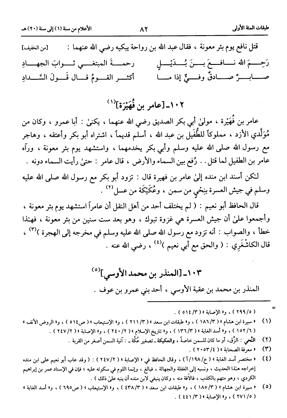 (5) «سيرة ابن هشام» (3/ 185)، و «طبقات ابن سعد» (3/ 438)، و «الاستيعاب» (ص 695)، و «أسد الغابة» (5/ 271)، و «الإصابة» (3/ 441).
