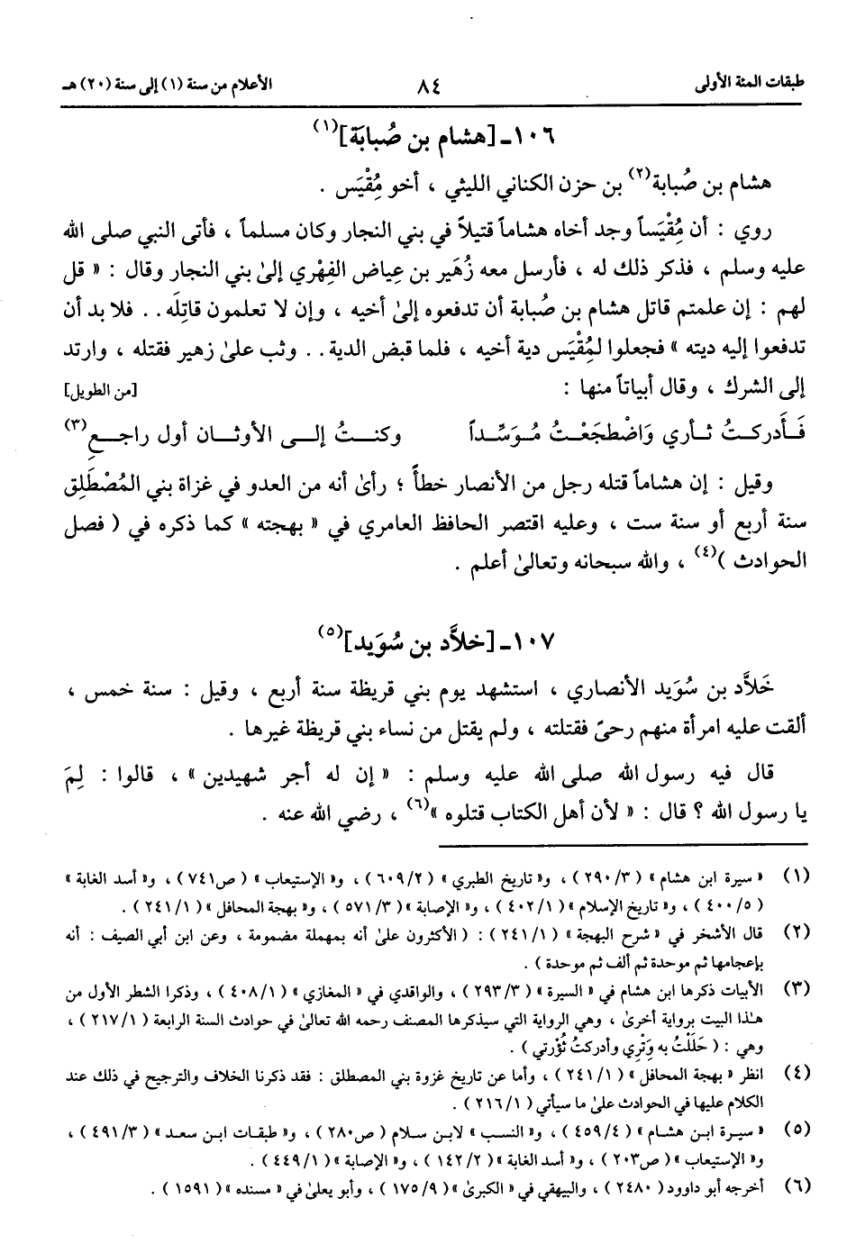 (1) «سيرة ابن هشام» (3/ 290)، و «تاريخ الطبري» (2/ 609)، و «الاستيعاب» (ص 741)، و «أسد الغابة» (5/ 400)، و «تاريخ الإسلام» (1/ 402)، و «الإصابة» (3/ 571)، و «بهجة المحافل» (1/ 241).
