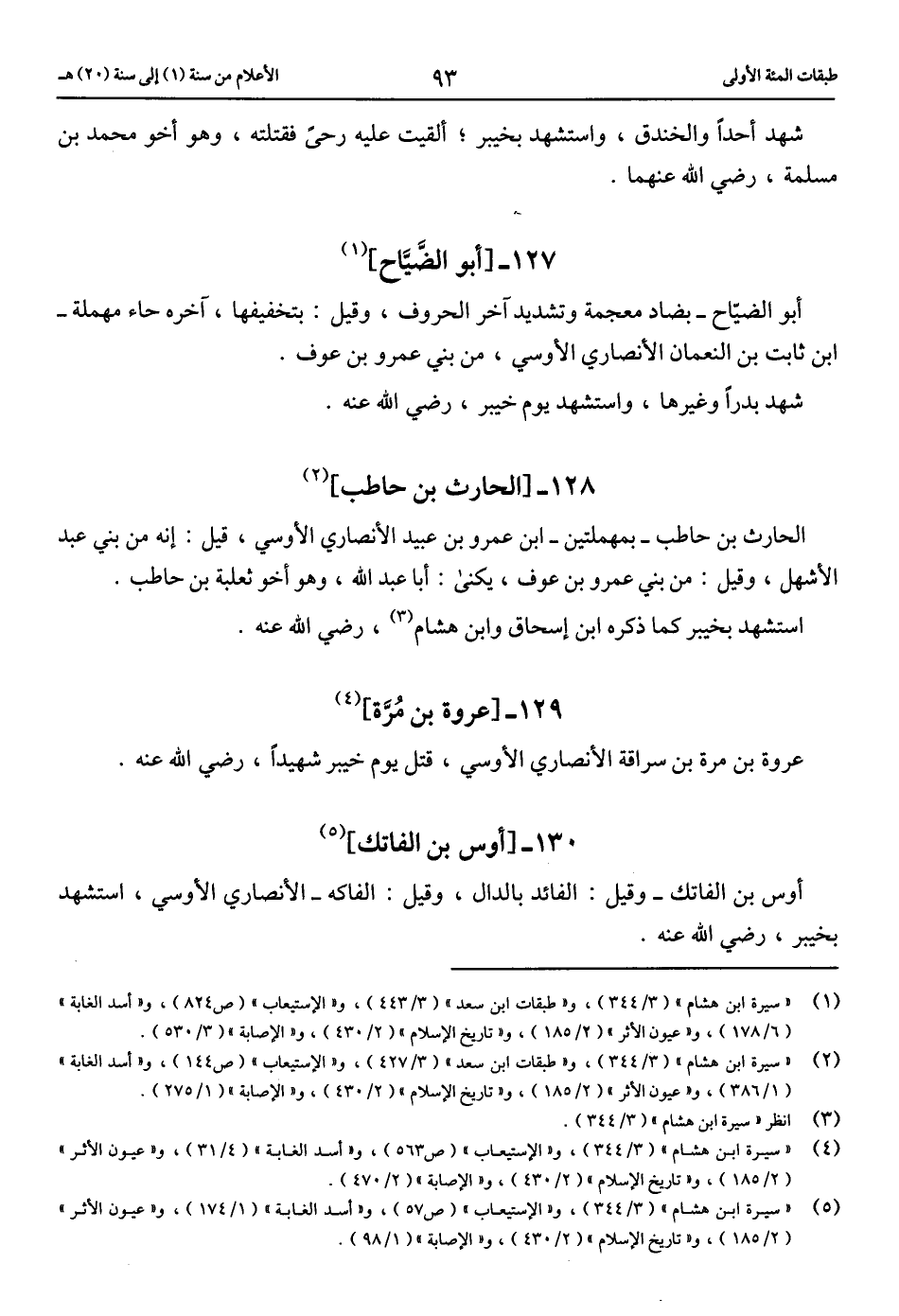 (2) «سيرة ابن هشام» (3/ 344)، و «طبقات ابن سعد» (3/ 427)، و «الاستيعاب» (ص 144)، و «أسد الغابة» (1/ 386)، و «عيون الأثر» (2/ 185)، و «تاريخ الإسلام» (2/ 430)، و «الإصابة» (1/ 275).