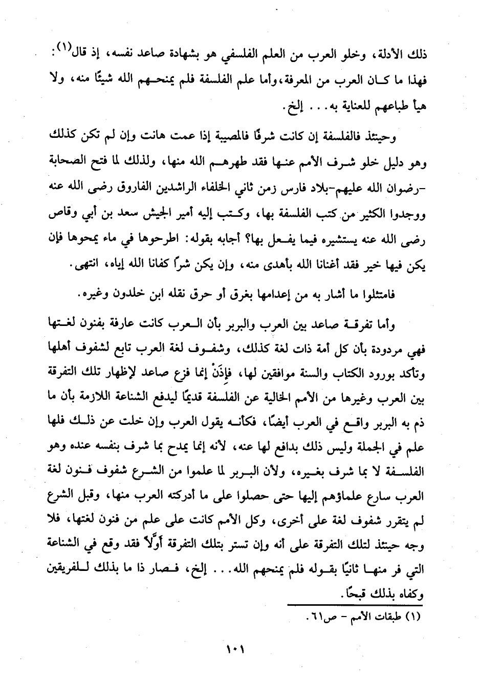 وأما تفرقة صاعد بين العرب والبربر بأن العرب كانت عارفة بفنون لغتها فهي مردودة بأن كل أمة ذات لغة كذلك، وشفوف لغة العرب تابع لشفوف أهلها وتأكد بورود الكتاب والسنة موافقين لها، فإِذَنْ إنما فزع صاعد لإظهار تلك التفرقة بين العرب وغيرها من الأمم الخالية عن الفلسفة قديمًا ليدفع الشناعة اللازمة بأن ما ذم به البربر واقع في العرب أيضًا، فكأنه يقول العرب وإن خلت عن ذلك فلها علم في الجملة وليس ذلك بدافع لها عنه، لأنه إنما يمدح بما شرف بنفسه عنده وهو الفلسفة لا بما شرف بغيره، ولأن البربر لما علموا من الشرع شفوف فنون لغة العرب سارع علماؤهم إليها حتى حصلوا على ما أدركته العرب منها، وقبل الشرع لم يتقرر شفوف لغة على أخرى، وكل الأمم كانت على علم من فنون لغتها، فلا وجه حينئذ لتلك التفرقة على أنه وإن تستر بتلك التفرقة أَوَّلاً فقد وقع في الشناعة التي فر منها ثانيًا بقوله فلم يمنحهم الله ... إلخ، فصار ذا ما بذلك للفريقين وكفاه بذلك قبحًا.