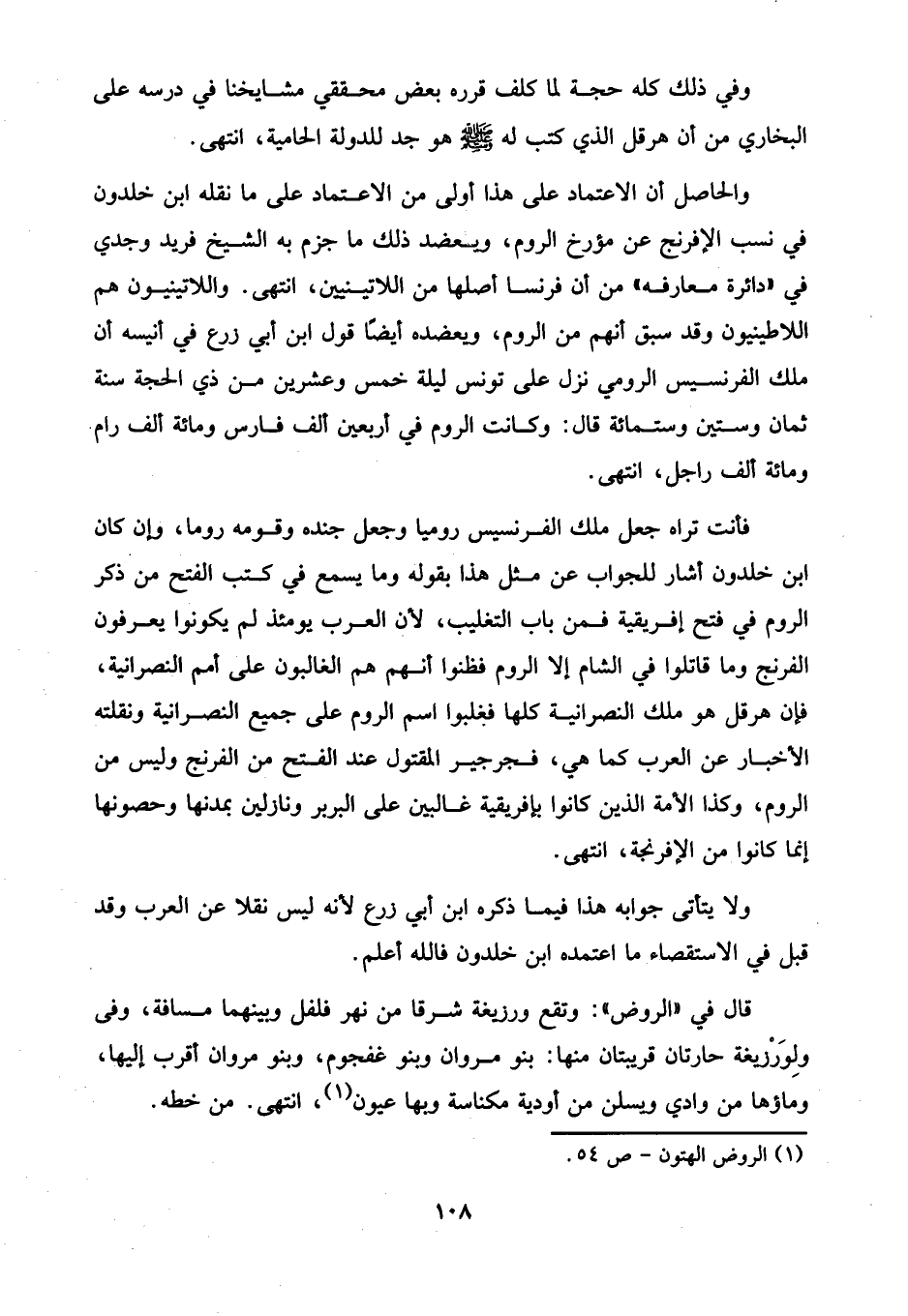 والحاصل أن الاعتماد على هذا أولى من الاعتماد على ما نقله ابن خلدون في نسب الإفرنج عن مؤرخ الروم، ويعضد ذلك ما جزم به الشيخ فريد وجدي في "دائرة معارفه" من أن فرنسا أصلها من اللاتينيين، انتهى. واللاتينيون هم اللاطينيون وقد سبق أنهم من الروم، ويعضده أيضًا قول ابن أبي زرع في أنيسه أن ملك الفرنسيس الرومي نزل على تونس ليلة خمس وعشرين من ذي الحجة سنة ثمان وستين وستمائة قال: وكانت الروم في أربعين ألف فارس ومائة ألف رام. ومائة ألف راجل، انتهى.
