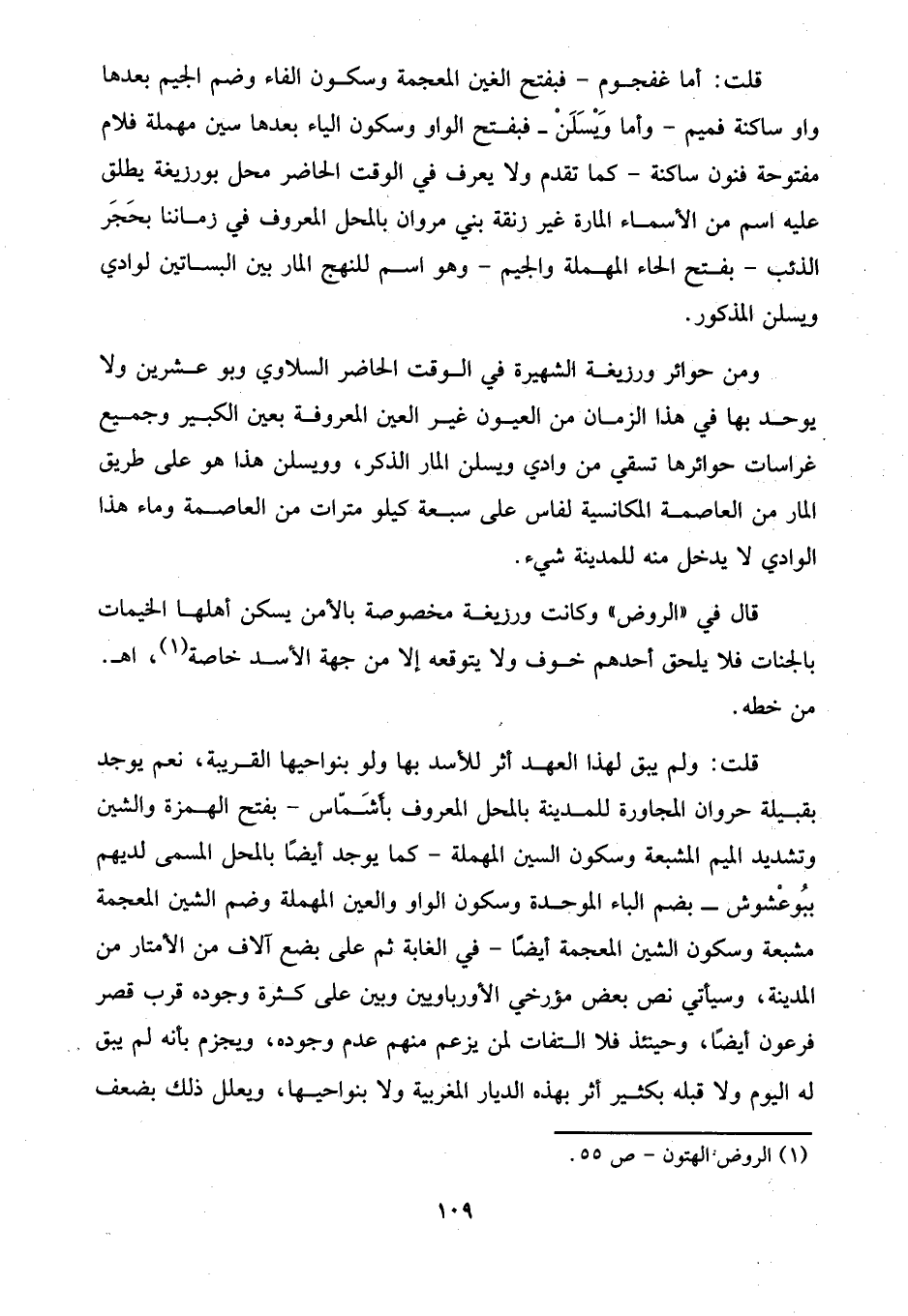 قلت: أما غفجوم -فبفتح الغين المعجمة وسكون الفاء وضم الجيم بعدها واو ساكنة فميم- وأما وَيْسَلَنْ -فبفتح الواو وسكون الياء بعدها سين مهملة فلام مفتوحة فنون ساكنة- كما تقدم ولا يعرف في الوقت الحاضر محل بورزيغة يطلق عليه اسم من الأسماء المارة غير زنقة بني مروان بالمحل المعروف في زماننا بحَجَر الذئب -بفتح الحاء المهملة والجيم- وهو اسم للنهج المار بين البساتين لوادي ويسلن المذكور.
