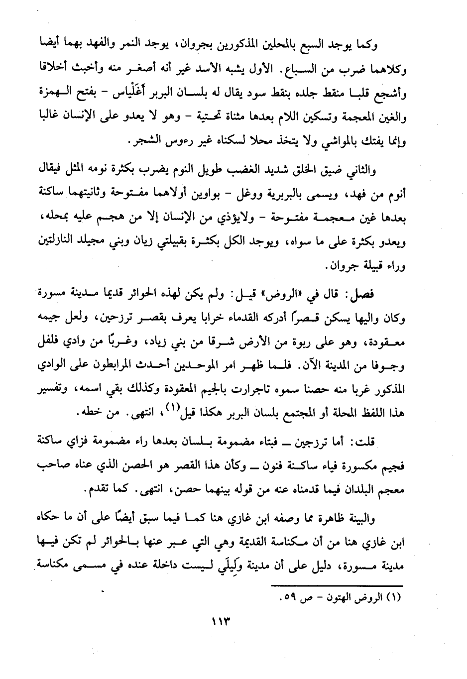 فصل: قال في "الروض" قيل: ولم يكن لهذه الحوائر قديما مدينة مسورة وكان واليها يسكن قصرًا أدركه القدماء خرابا يعرف بقصر ترزحين، ولعل جيمه معقودة، وهو على ربوة من الأرض شرقا من بني زياد، وغربًا من وادي فلفل وجوفا من المدينة الآن. فلما ظهر أمر الموحدين أحدث المرابطون على الوادي المذكور غربا منه حصنا سموه تاجرارت بالجيم المعقودة وكذلك بقي اسمه، وتفسير هذا اللفظ المحلة أو المجتمع بلسان البربر هكذا قيل (¬1)، انتهى. من خطه.