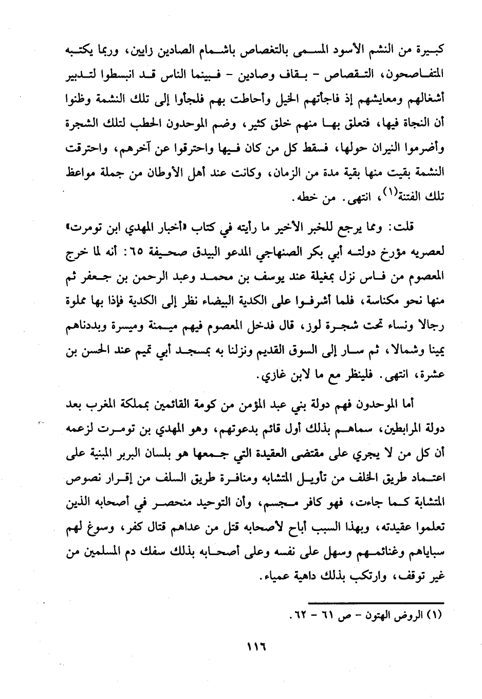 أما الموحدون فهم دولة بني عبد المؤمن من كومة القائمين بمملكة المغرب بعد دولة المرابطين، سماهم بذلك أول قائم بدعوتهم، وهو المهدي بن تومرت لزعمه أن كل من لا يجري على مقتضى العقيدة التي جمعها هو بلسان البربر المبنية على اعتماد طريق الخلف من تأويل المتشابه ومنافرة طريق السلف من إقرار نصوص المتشابه كما جاءت، فهو كافر مجسم، وأن التوحيد منحصر في أصحابه الذين تعلموا عقيدته، وبهذا السبب أباح لأصحابه قتل من عداهم قتال كفر، وسوغ لهم سباياهم وغنائمهم وسهل على نفسه وعلى أصحابه بذلك سفك دم المسلمين من غير توقف، وارتكب بذلك داهية عمياء.