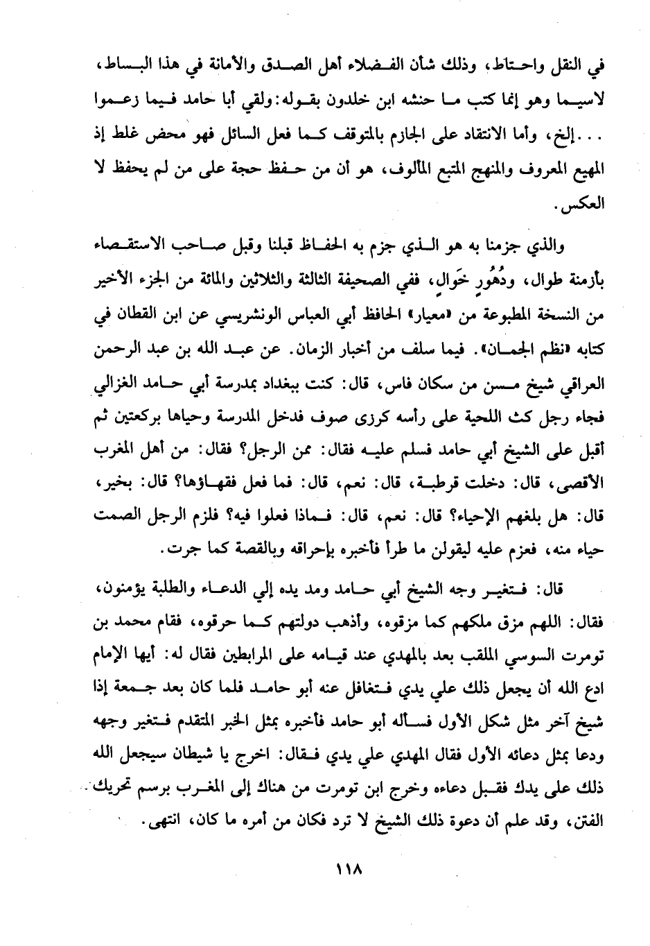 والذي جزمنا به هو الذي جزم به الحفاظ قبلنا وقبل صاحب الاستقصاء بأزمنة طوال، ودُهُورٍ خَوالٍ، ففي الصحيفة الثالثة والثلاثين والمائة من الجزء الأخير من النسخة المطبوعة من "معيار" الحافظ أبي العباس الونشريسي عن ابن القطان في كتابه "نظم الجمان". فيما سلف من أخبار الزمان. عن عبد الله بن عبد الرحمن العراقي شيخ مسن من سكان فاس، قال: كنت ببغداد بمدرسة أبي حامد الغزالي فجاء رجل كث اللحية على رأسه كرزى صوف فدخل المدرسة وحياها بركعتين ثم أقبل على الشيخ أبي حامد فسلم عليه فقال: ممن الرجل؟ فقال: من أهل المغرب الأقصى، قال: دخلت قرطبة، قال: نعم، قال: فما فعل فقهاؤها؟ قال: بخير، قال: هل بلغهم الإحياء؟ قال: نعم، قال: فماذا فعلوا فيه؟ فلزم الرجل الصمت حياء منه، فعزم عليه ليقولن ما طرأ فأخبره بإحراقه وبالقصة كما جرت.