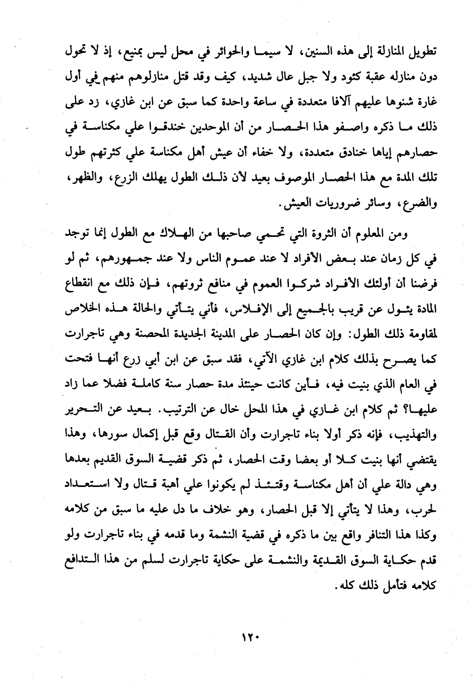ومن المعلوم أن الثروة التي تحمي صاحبها من الهلاك مع الطول إنما توجد في كل زمان عند بعض الأفراد لا عند عموم الناس ولا عند جمهورهم، ثم لو فرضنا أن أولئك الأفراد شركوا العموم في منافع ثروتهم، فإن ذلك مع انقطاع المادة يئول عن قريب بالجميع إلى الإفلاس، فأني يتأتي والحالة هذه الخلاص لمقاومة ذلك الطول: وإن كان الحصار على المدينة الجديدة المحصنة وهي تاجرارت كما يصرح بذلك كلام ابن غازي الآتي، فقد سبق عن ابن أبي زرع أنها فتحت في العام الذي بنيت فيه، فأين كانت حينئذ مدة حصار سنة كاملة فضلا عما راد عليها؟ ثم كلام ابن غازي في هذا المحل خال عن الترتيب. بعيد عن التحرير والتهذيب، فإنه ذكر أولا بناء تاجرارت وأن القتال وقع قبل إكمال سورها، وهذا يقتضي أنها بنيت كلا أو بعضا وقت الحصار، ثم ذكر قضية السوق القديم بعدها وهي دالة على أن أهل مكناسة وقتئذ لم يكونوا على أهبة قتال ولا استعداد لحرب، وهذا لا يتأتي إلا قبل الحصار، وهو خلاف ما دل عليه ما سبق من كلامه وكذا هذا التنافر واقع بين ما ذكره في قضية النشمة وما قدمه في بناء تاجرارت ولو قدم حكاية السوق القديمة والنشمة على حكاية تاجرارت لمسلم من هذا التدافع كلامه فتأمل ذلك كله.