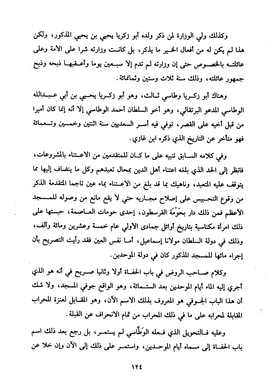 وكلام صاحب الروض في باب الحفاة أولا وثانيا صريح في أنه هو الذي أجري إليه الماء أيام الموحدين بعد الستمائة، وهو الواقع جوفي المسجد، ولا شك أن هذا الباب الجوفي هو المعروف بذلك الاسم الآن، وهو المقابل لعنزة المحراب المقابلة لمحرابه على ما في ذلك المحراب من تمام الانحراف عن القبلة.