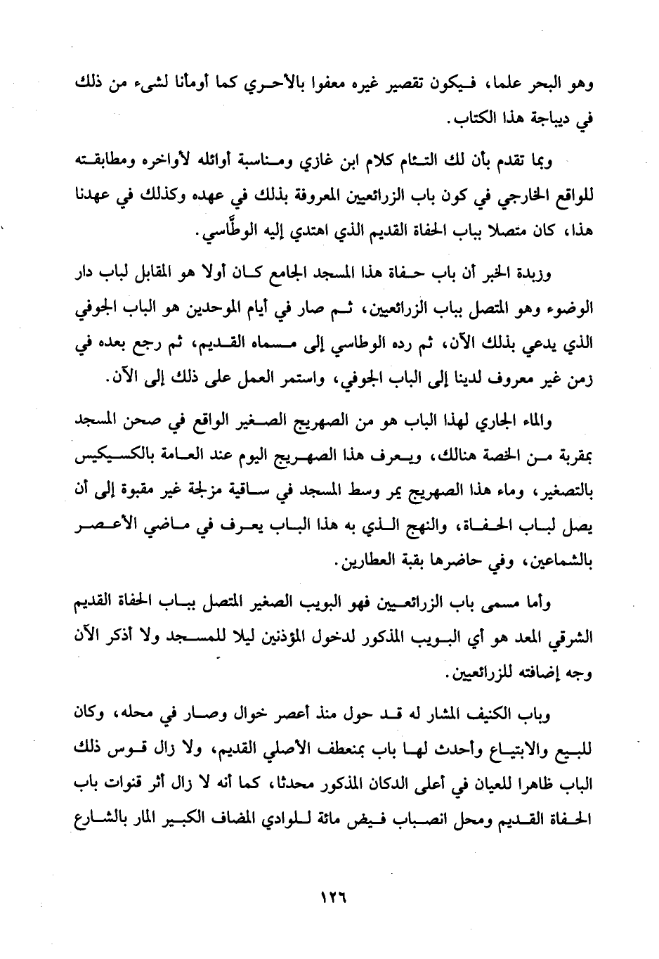 وأما مسمى باب الزرائعيين فهو البويب الصغير المتصل بباب الحفاة القديم الشرقي المعد هو أي البويب المذكور لدخول المؤذنين ليلا للمسجد ولا أذكر الآن وجه إضافته للزرائعيين.