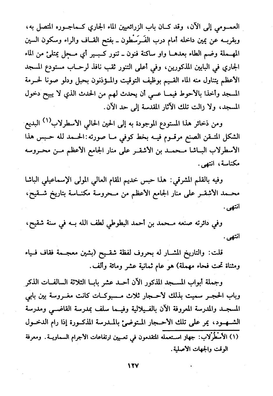 ومن ذخائر هذا المستودع الموجودة به إلى الحين الحالي الأسطرلاب (¬1) البديع الشكل المتقن الصنع مرقوم فيه بخط كوفي ما صورته: الحمد لله حبس هذا الأسطرلاب الباشا محمد بن الأشقر على منار الجامع الأعظم من محروسه مكناسة، انتهى.
