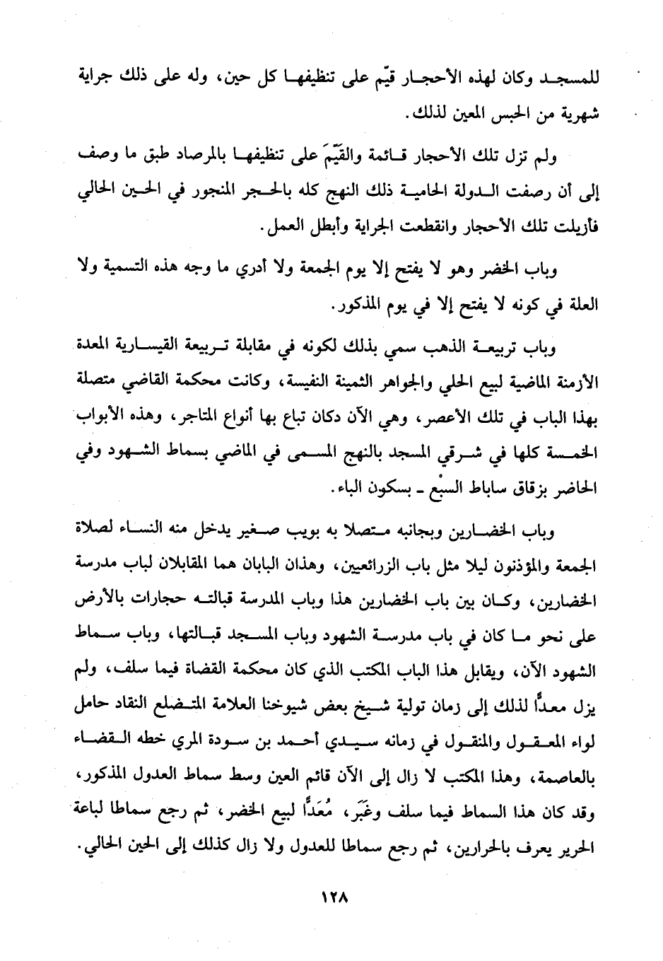 وباب الخضارين وبجانبه متصلا به بويب صغير يدخل منه النساء لصلاة الجمعة والمؤذنون ليلا مثل باب الزرائعيين، وهذان البابان هما المقابلان لباب مدرسة الخضارين، وكان بين باب الخضارين هذا وباب المدرسة قبالته حجارات بالأرض على نحو ما كان في باب مدرسة الشهود وباب المسجد قبالتها، وباب سماط الشهود الآن، ويقابل هذا الباب المكتب الذي كان محكمة القضاة فيما سلف، ولم يزل معدًّا لذلك إلى زمان تولية شيخ بعض شيوخنا العلامة المتضلع النقاد حامل لواء المعقول والمنقول في زمانه سيدي أحمد بن سودة المري خطه القضاء بالعاصمة، وهذا المكتب لا زال إلى الآن قائم العين وسط سماط العدول المذكور، وقد كان هذا السماط فيما سلف وغَبَر، مُعَدًّا لبيع الخضر، ثم رجع سماطا لباعة الحرير يعرف بالحرارين، ثم رجع سماطا للعدول ولا زال كذلك إلى الحين الحالي.