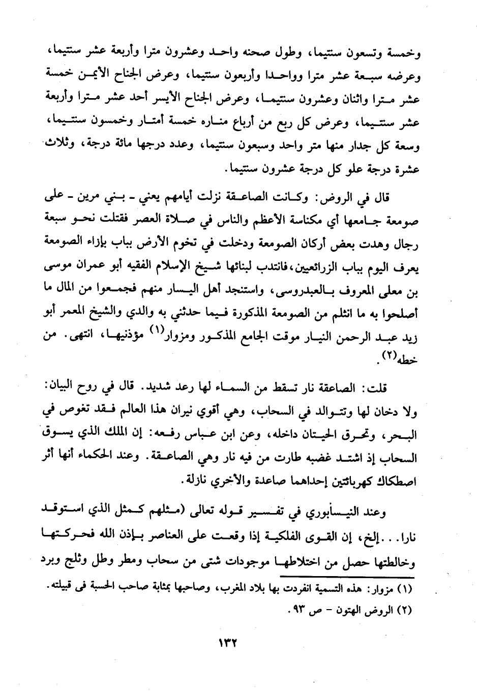 قال في الروض: وكانت الصاعقة نزلت أيامهم يعني -بني مرين- على صومعة جامعها أي مكناسة الأعظم والناس في صلاة العصر فقتلت نحو سبعة رجال وهدت بعض أركان الصومعة ودخلت في تخوم الأرض بباب بإزاء الصومعة يعرف اليوم بباب الزرائعيين، فانتدب لبنائها شيخ الإسلام الفقيه أبو عمران موسى بن معلى المعروف بالعبدروسى، واستنجد أهل اليسار منهم فجمعوا من المال ما أصلحوا به ما انثلم من الصومعة المذكورة فيما حدثني به والدي والشيخ المعمر أبو زيد عبد الرحمن النيار موقت الجامع المذكور ومزوار (¬1) مؤذنيها، انتهى. من خطه (¬2).