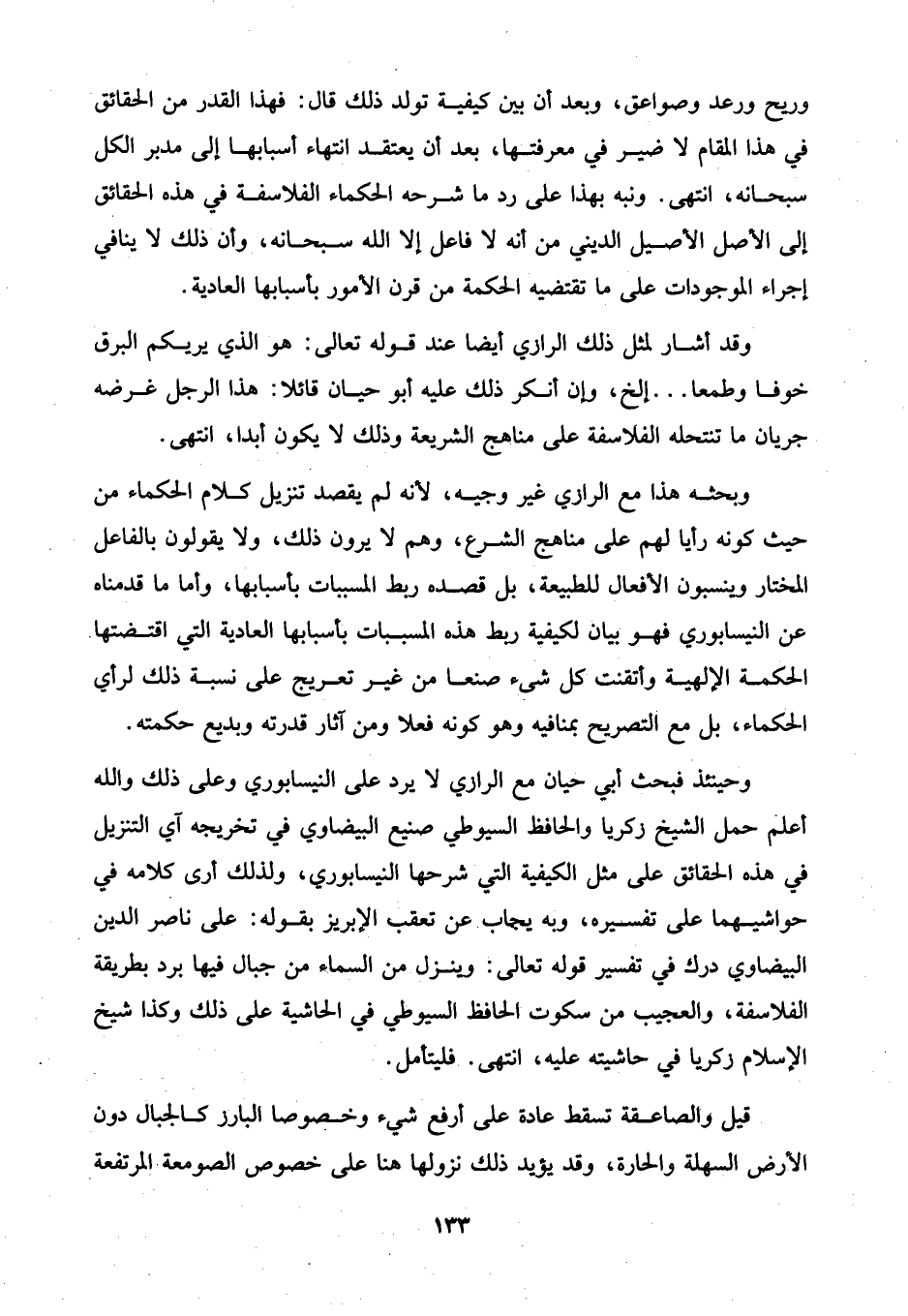 وبحثه هذا مع الرازي غير وجيه، لأنه لم يقصد تنزيل كلام الحكماء من حيث كونه رأيا لهم على مناهج الشرع، وهم لا يرون ذلك، ولا يقولون بالفاعل المختار وينسبون الأفعال للطبيعة، بل قصده ربط المسببات بأسبابها، وأما ما قدمناه عن النيسابوري فهو بيان لكيفية ربط هذه المسببات بأسبابها العادية التي اقتضتها. الحكمة الإلهية وأتقنت كل شئ صنعا من غير تعريج على نسبة ذلك لرأي الحكماء، بل مع التصريح بمنافيه وهو كونه فعلا ومن آثار قدرته وبديع حكمته.