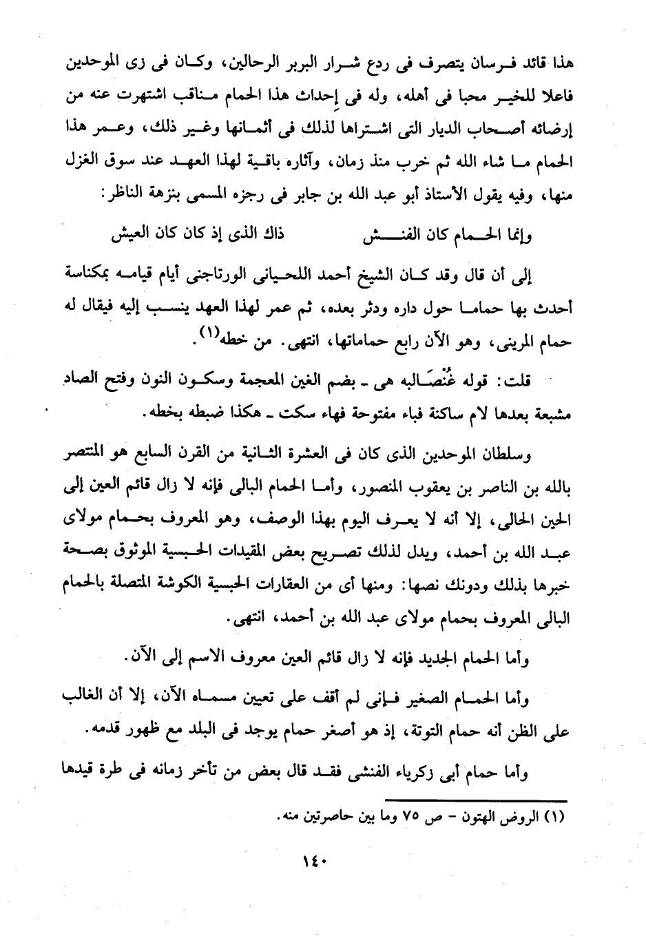 إلى أن قال وقد كان الشيخ أحمد اللحيانى الورتاجنى أيام قيامه بمكناسة أحدث بها حماما حول داره ودثر بعده، ثم عمر لهذا العهد ينسب إليه فيقال له حمام المرينى، وهو الآن رابع حماماتها، انتهى. من خطه (¬1).