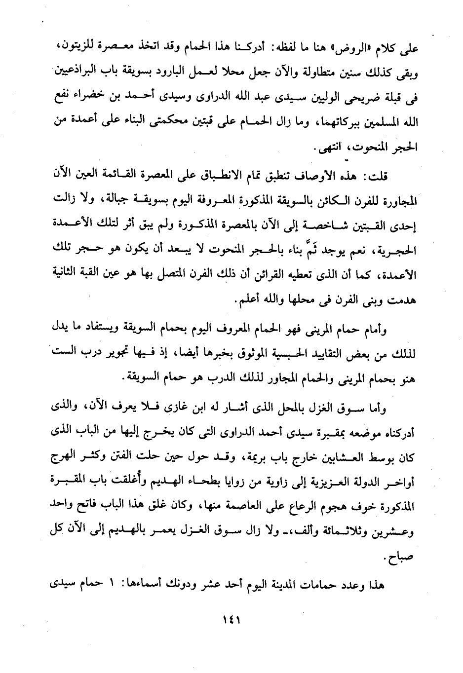 على كلام "الروض" هنا ما لفظه: أدركنا هذا الحمام وقد اتخذ معصرة للزيتون، وبقى كذلك سنين متطاولة والآن جعل محلا لعمل البارود بسويقة باب البراذعيين في قبلة ضريحى الوليين سيدى عبد الله الدراوى وسيدى أحمد بن خضراء نفع الله المسلمين ببركاتهما، وما زال الحمام على قبتين محكمتى البناء على أعمدة من الحجر المنحوت، انتهى.