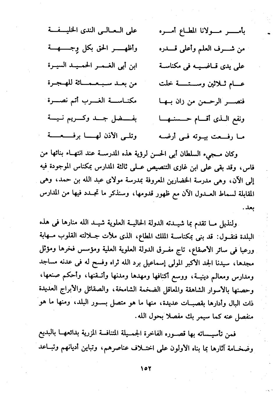 ولنذيل ما تقدم بما شيدته الدولة الحالية العلوية شيد الله منارها في هذه البلدة فنقول: قد بني بمكناسة الملك المطاع، الذي ملأت جلالته القلوب مهابة ورعبا في سائر الأصقاع، تاج مفرق الدولة العلوية العلية ومؤسس فخرها ومؤثل مجدها، سيدنا الجد الأكبر المولى إسماعيل برد الله ثراه وفسح له في عدنه مساجد ومدارس ومعالم دينية، ووسع كنافها ومهدها ومدنها وأتقنها، وأحكم صنعها، وحصنها بالأسوار الشاهقة والمعاقل الضخمة الشامخة، والصقائل والأبراج العديدة ذات البال وأدارها بقصبات عديدة، منها ما هو متصل بسور البلد، ومنها ما هو منفصل عنه كما سيمر بك مفصلا بحول الله.