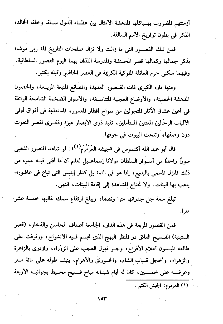 ومنها داره الكبرى ذات القصور العديدة والمصانع المنيعة المريعة، والحصون المدهشة الحصينة، والأوضاع العجيبة المتناسقة، والأسوار الضخمة الشامخة الرائقة في أعين عشاق الآثار المتجولين من سواح أقطار المعمور، المستعذبة في أذواق أولى الألباب الرحّالين المعتنين المتأملين، تفيد ذوى الأبصار عبرة وذكرى تقصر النعوت دون وصفها، وتنحت البيوت في جوفها.