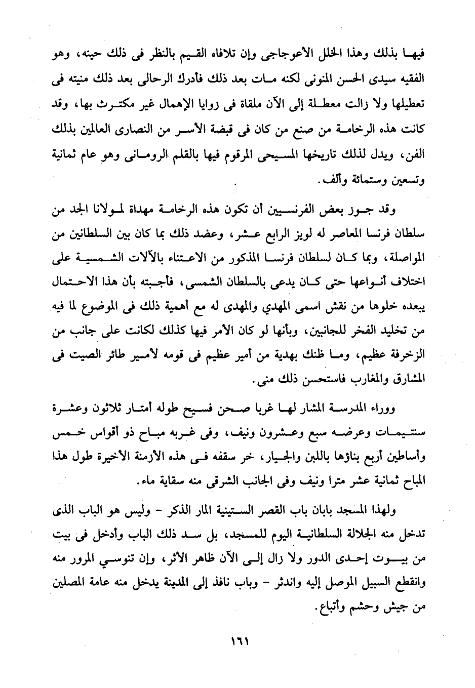 فيها بذلك وهذا الخلل الأعوجاجى وإن تلافاه القيم بالنظر في ذلك حينه، وهو الفقيه سيدي الحسن المنونى لكنه مات بعد ذلك فأدرك الرحالى بعد ذلك منيته في تعطيلها ولا زالت معطلة إلى الآن ملقاة في زوايا الإهمال غير مكترث بها، وقد كانت هذه الرخامة من صنع من كان في قبضة الأسر من النصارى العالمين بذلك الفن، ويدل لذلك تاريخها المسيحى المرقوم فيها بالقلم الرومانى وهو عام ثمانية وتسعين وستمائة وألف.