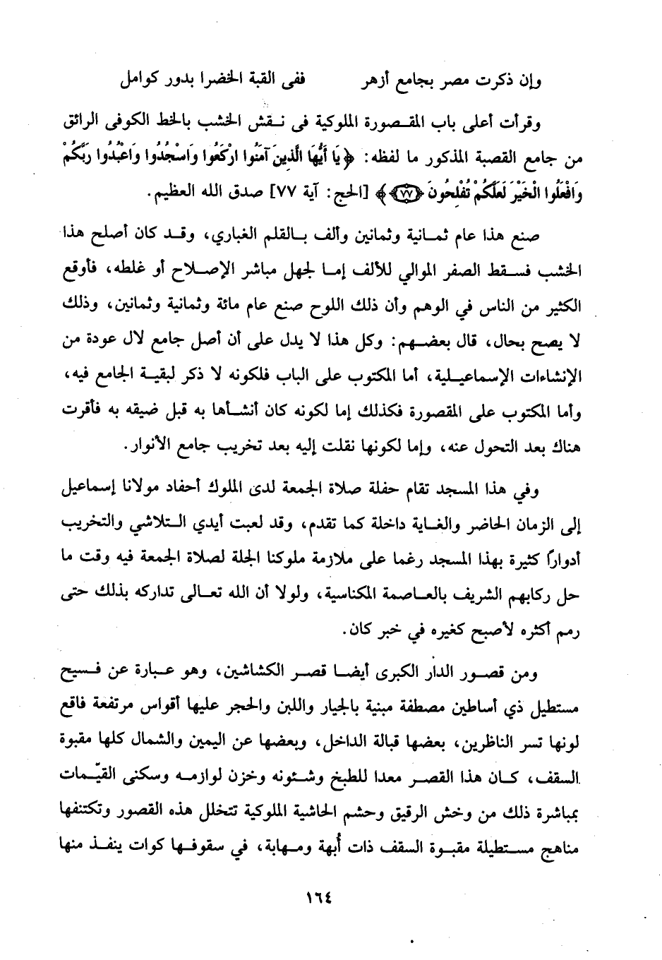 وقرأت أعلى باب المقصورة الملوكية في نقش الخشب بالخط الكوفي الرائق من جامع القصبة المذكور ما لفظه: {يَاأَيُّهَا الَّذِينَ آمَنُوا ارْكَعُوا وَاسْجُدُوا وَاعْبُدُوا رَبَّكُمْ وَافْعَلُوا الْخَيْرَ لَعَلَّكُمْ تُفْلِحُونَ (77)} [الحج: 77] صدق الله العظيم.