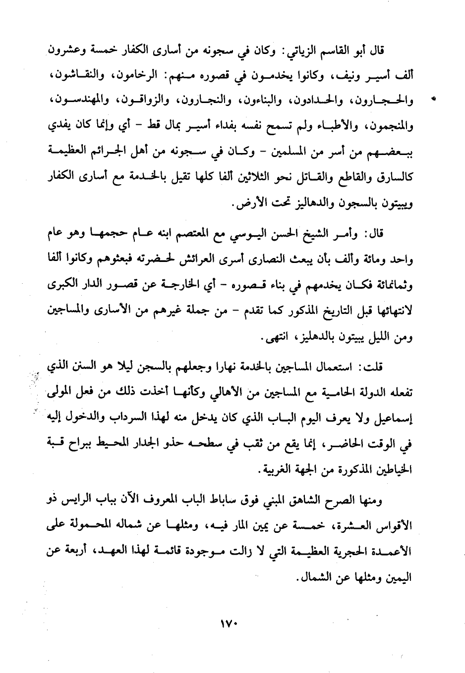 قال: وأمر الشيخ الحسن اليوسي مع المعتصم ابنه عام حجمها وهو عام واحد ومائة وألف بأن يبعث النصارى أسرى العرائش لحضرته فبعثوهم وكانوا ألفا وثمانمائة فكان يخدمهم في بناء قصوره -أي الخارجة عن قصور الدار الكبرى لانتهائها قبل التاريخ المذكور كما تقدم- من جملة غيرهم من الأسارى والمساجين ومن الليل يبيتون بالدهليز، انتهى.