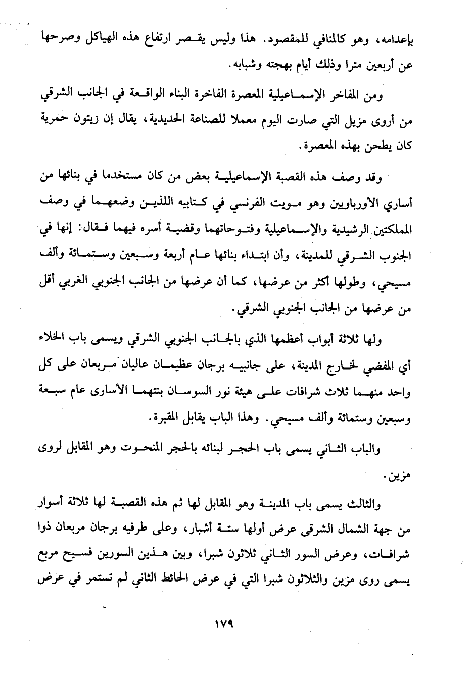 والثالث يسمى باب المدينة وهو المقابل لها ثم هذه القصبة لها ثلاثة أسوار من جهة الشمال الشرقى عرض أولها ستة أشبار، وعلى طرفيه برجان مربعان ذوا شرافات، وعرض السور الثاني ثلاثون شبرا، وبين هذين السورين فسيح مربع يسمى روى مزين والثلاثون شبرا التي في عرض الحائط الثاني لم تستمر في عرض