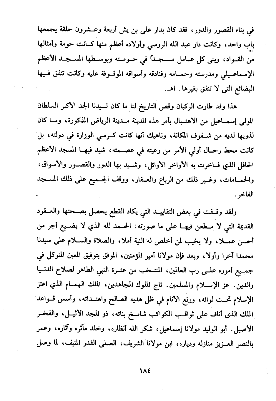 هذا وقد طارت الركبان وقص التاريخ لنا ما كان لسيدنا الجد الأكبر السلطان المولى إسماعيل من الاهتبال بأمر هذه المدينة مدينة الرياض المذكورة، وما كان لذويها لديه من شفوف المكانة، وناهيك أنها كانت كرسي الوزارة في دولته، بل كانت محيي رحال أولي الأمر من رعيته في عصمته، شيد فيها المسجد الأعظم الحافل الذي فاخرت به الأواخر الأوائل، وشيد بها الدور والقصور والأسواق، والحمامات، وغير ذلك من الرباع والعقار، ووقف الجميع على ذلك المسجد الفاخر.