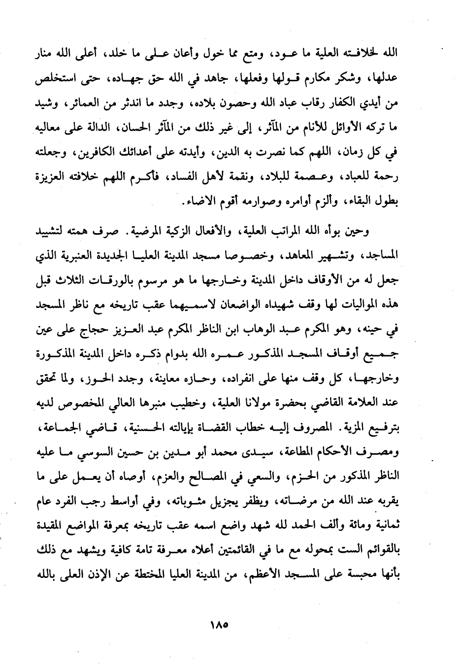 وحين بوأه الله المراتب العلية، والأفعال الزكية المرضية. صرف همته لتشييد المساجد، وتشهير المعاهد، وخصوصا مسجد المدينة العليا الجديدة العنبرية الذي جعل له من الأوقاف داخل المدينة وخارجها ما هو مرسوم بالورقات الثلاث قبل هذه المواليات لها وقف شهيداه الواضعان لاسميهما عقب تاريخه مع ناظر المسجد في حينه، وهو المكرم عبد الوهاب ابن الناظر المكرم عبد العزيز حجاج على عين جميع أوقاف المسجد المذكور عمره الله بدوام ذكره داخل المدينة المذكورة وخارجها، كل وقف منها على انفراده، وحازه معاينة، وجدد الحوز، ولما تحقق عند العلامة القاضي بحضرة مولانا العلية، وخطيب منبرها العالي المخصوص لديه بترفيع المزية. المصروف إليه خطاب القضاة بإيالته الحسنية، قاضي الجماعة، ومصرف الأحكام المطاعة، سيدي محمَّد أبو مدين بن حسين السوسي ما عليه الناظر المذكور من الحزم، والسعي في المصالح والعزم، أوصاه أن يعمل على ما يقربه عند الله من مرضاته، ويظفر بجزيل مثوباته، وفي أواسط رجب الفرد عام ثمانية ومائة وألف الحمد لله شهد واضع اسمه عقب تاريخه بمعرفة المواضع المقيدة بالقوائم الست بمحوله مع ما في القائمتين أعلاه معرفة تامة كافية ويشهد مع ذلك بأنها محبسة على المسجد الأعظم، من المدينة العليا المختطة عن الإذن العلى بالله