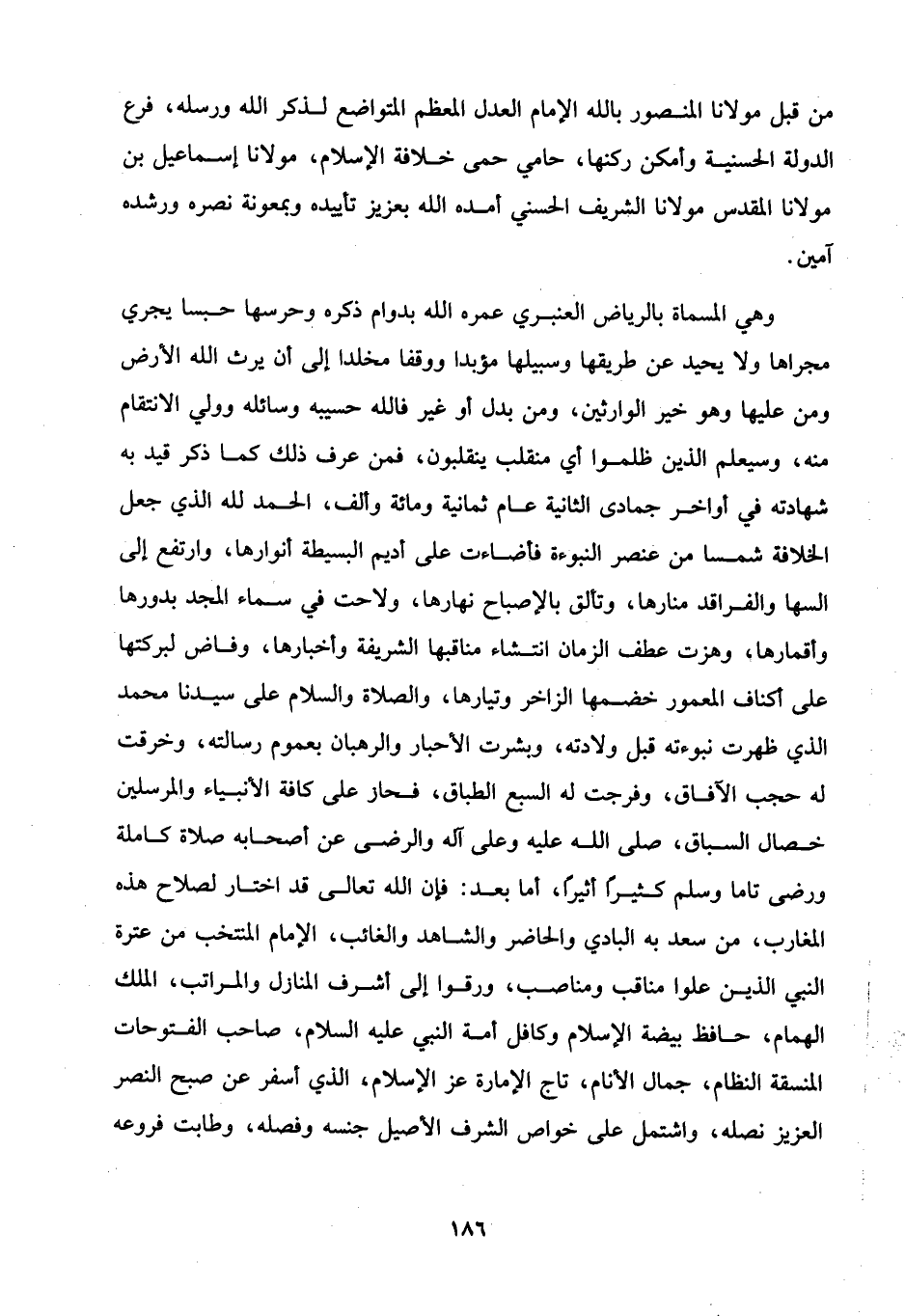 من قبل مولانا المنصور بالله الإمام العدل المعظم المتواضع لذكر الله ورسله، فرع الدولة الحسنية وأمكن ركنها، حامي حمى خلافة الإِسلام، مولانا إسماعيل بن مولانا المقدس مولانا الشريف الحسني أمده الله بعزيز تأييده وبمعونة نصره ورشده آمين.
