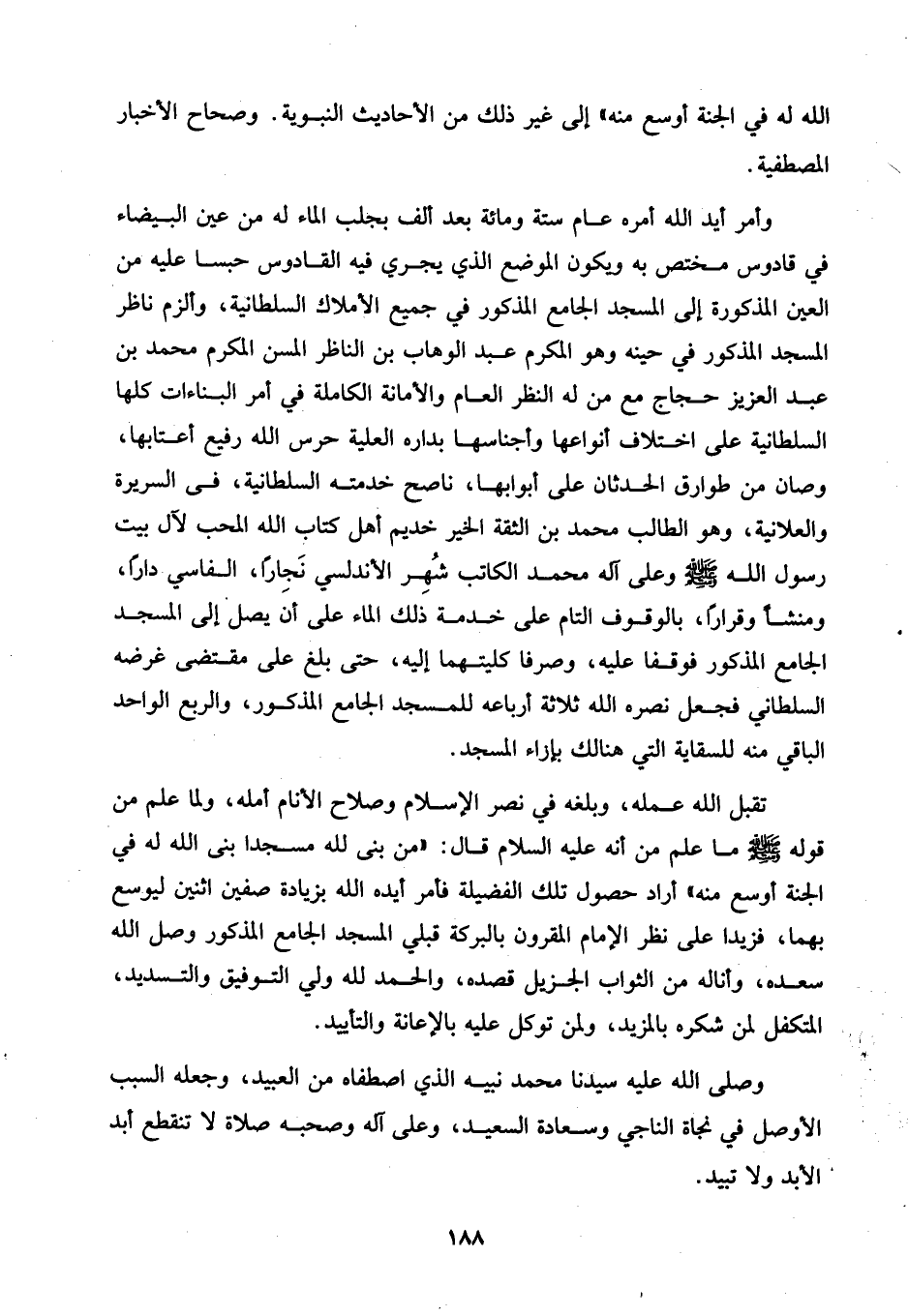 تقبل الله عمله، وبلغه في نصر الإِسلام وصلاح الأنام أمله، ولما علم من قوله - صلى الله عليه وسلم - ما علم من أنه عليه السلام قال: "من بنى لله مسجدا بنى الله له في الجنة أوسع منه" أراد حصول تلك الفضيلة فأمر أيده الله بزيادة صفين اثنين ليوسع بهما، فزيدا على نظر الإمام المقرون بالبركة قبلي المسجد الجامع المذكور وصل الله سعده، وأناله من الثواب الجزيل قصده، والحمد لله ولي التوفيق والتسديد، المتكفل لمن شكره بالمزيد، ولمن توكل عليه بالإعانة والتأييد.