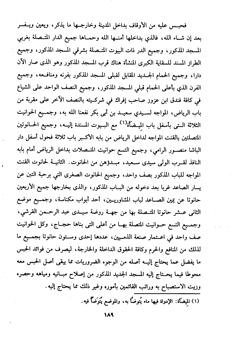 فحبس عليه من الأوقاف بداخل المدينة وخارجها ما يذكر، ويعين ويفسر بعد إن شاء الله، فالذي بداخلها أمنها الله وسماها جميع الدار المتصلة بغربي المسجد المذكور، وجميع الدر ذات البيوت المتصلة بشرقي المسجد المذكور، وجميع الطراز المسند للسقاية الكبرى المنشأة هناك قرب المسجد المذكور وهو الذي صار الآن دارا، وجميع الحمام الجديد المقابل لقبلى المسجد المذكور بفرنه ومنافعه، وجميع الفرن الذي بأعلى الحمام قبلي المسجد المذكور، وجميع النصف الواحد على الشياع في كافة فندق ابن عزور صاحب إفراك في شركيته بالنصف الآخر على مقربة من باب الرياض، المواجه لسيدي سعيد بن أبي بكر نفعنا الله به، وجميع الحوانيت الثلاثة التي بأسفل باب المِيضَأَة (¬1) مع البيوت المسندة إليه، وجميع الحانوتين المتصلتين بالقنت المواجه لداخل الرياض من بابه الأكبر باب ثلاثة فحول أسفل دار الباشا منصور الرامي، وجميع التسع حوانيت المتصلات بداخل الرياض أمام بابه النافذ لقرب الولى سيدي سعيد، مبدؤهن من الحانوت. الثانية لحانوت القنت المواجه للباب المذكور بصف واحد، وجميع الحانوت الصغرى التي برحبة التبن عن يسار الصاعد غربا بعد دخوله من الباب المذكور، والذي بخارجها جميع الأربعين حانوتا عن يمين الصاعد لباب المشاوريين، أحد أبواب مكناسة، وجميع موضع الثاني عشر حانوتا المتصلة بها من جهة روضة سيدي عبد الرحمن القرشي، وجميع التسع حوانيت المتصلة بها من أعلى التي بناها حجاج، وكل الحوانيت صف واحد في اعتمار صنعة الذميين، عددها إحدى وستون حانوتا بجميع ما لذلك من المنافع والحرم وكافة الحقوق الداخلة والخارجة، ليصرف من فوائد الحبس ما يفضل عما يحتاج إليه أصله من الوجوه الضروريات مما يبقى أصل الحبس معه محوطا فيما يحتاج إليه المسجد الجديد المذكور من إصلاح مبانيه ومياهه وحصره وزيت الاستصباح به وراتب القائمين بأموره وغير ذلك مما يحتاج إليه.
