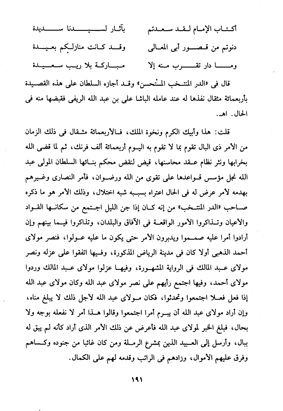 قلت: هذا وأبيك الكرم ونخوة الملك، فالأربعمائة مثقال في ذلك الزمان من الأمر ذى البال تقوم بما لا تقوم به اليوم أربعمائة ألف فرنك، ثم لما قضى الله بخرابها ونثر نظام عقد محاسنها، قيض لنقض محكم بنائها السلطان المولى عبد الله نجدٍ مؤسس قواعدها على تقوى من الله ورضوان، فأمر النصارى وغيرهم بهدمه لأمر عرض له في الحال اعتراه بسببه شبه اختلال، وذلك الأمر هو ما ذكره صاحب "الدر المنتخب" من إنه كان إذا جن الليل اجتمع من سكانها القواد والأعيان وتذاكروا الأمور الواقعة في الآفاق والبلدان، وتذاكروا فيما بينهم وإن أرادوا أمرا عليه صمموا ويدبرون الأمر حتى يكون ما عليه عولوا، فنصر مولاى أحمد الذهبي أولا كان في مدينة الرياض المذكورة، وفيها اتفقوا على عزله ونصر مولاى عبد المالك في الرواية المشهورة، وفيها عزلوا مولاى عبد المالك وردوا مولاى أحمد، وفيها اجتمع رأيهم على نصر مولاى عبد الله وكان مولاى عبد الله إذا فعل فعلا اجتمعوا وتحدثوا، فكان مولاى عبد الله لأجل ذلك لا يبلغ مناه، وإن أراد مولاى عبد الله أن يبرم أمرا اجتمعوا وقالوا هذا أمر لا نفعله بوجه ولا بحال، فبلغ الخبر لمولاى عبد الله فأعرض عن ذلك الأمر الذي أراد كأنه لم يبق له ببال، وأرسل إلى العبيد الذين بمشرع الرملة ومن كان غائبا من جنوده وكساهم وفرق عليهم الأموال، وزادهم في الراتب وقدمه لهم على الكمال.
