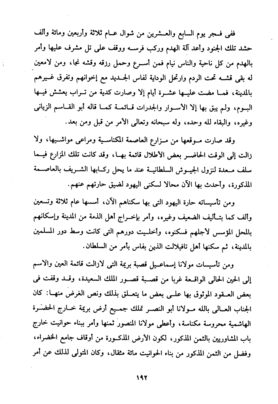 وقد صارت موقعها من مزارع العاصمة المكناسية ومراعى مواشيها, ولا زالت إلى الوقت الحاضر بعض الأطلال قائمة بها، وقد كانت تلك المزارع فيما سلف معدة لنزول الجيوش السلطانية عند ما يحل ركابها الشريف بالعاصمة المذكورة، وأحدث بها الآن محالا لسكنى اليهود لضيق حارتهم عنهم.