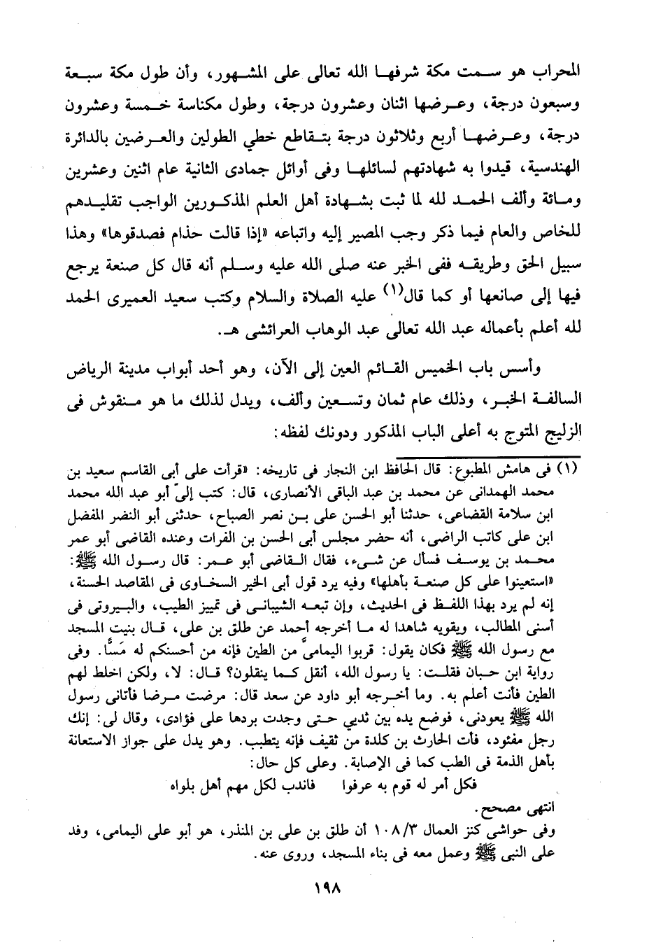 المحراب هو سمت مكة شرفها الله تعالى على المشهور، وأن طول مكة سبعة وسبعون درجة، وعرضها اثنان وعشرون درجة، وطول مكناسة خمسة وعشرون درجة، وعرضها أربع وثلاثون درجة بتقاطع خطي الطولين والعرضين بالدائرة الهندسية، قيدوا به شهادتهم لسائلها وفي أوائل جمادى الثانية عام اثنين وعشرين ومائة وألف الحمد لله لما ثبت بشهادة أهل العلم المذكورين الواجب تقليدهم للخاص والعام فيما ذكر وجب المصير إليه واتباعه "إذا قالت حذام فصدقوها" وهذا سبيل الحق وطريقه ففي الخبر عنه صلى الله عليه وسلم أنه قال كل صنعة يرجع فيها إلى صانعها أو كما قال (¬1) عليه الصلاة والسلام وكتب سعيد العميرى الحمد لله أعلم بأعماله عبد الله تعالى عبد الوهاب العرائشى هـ.