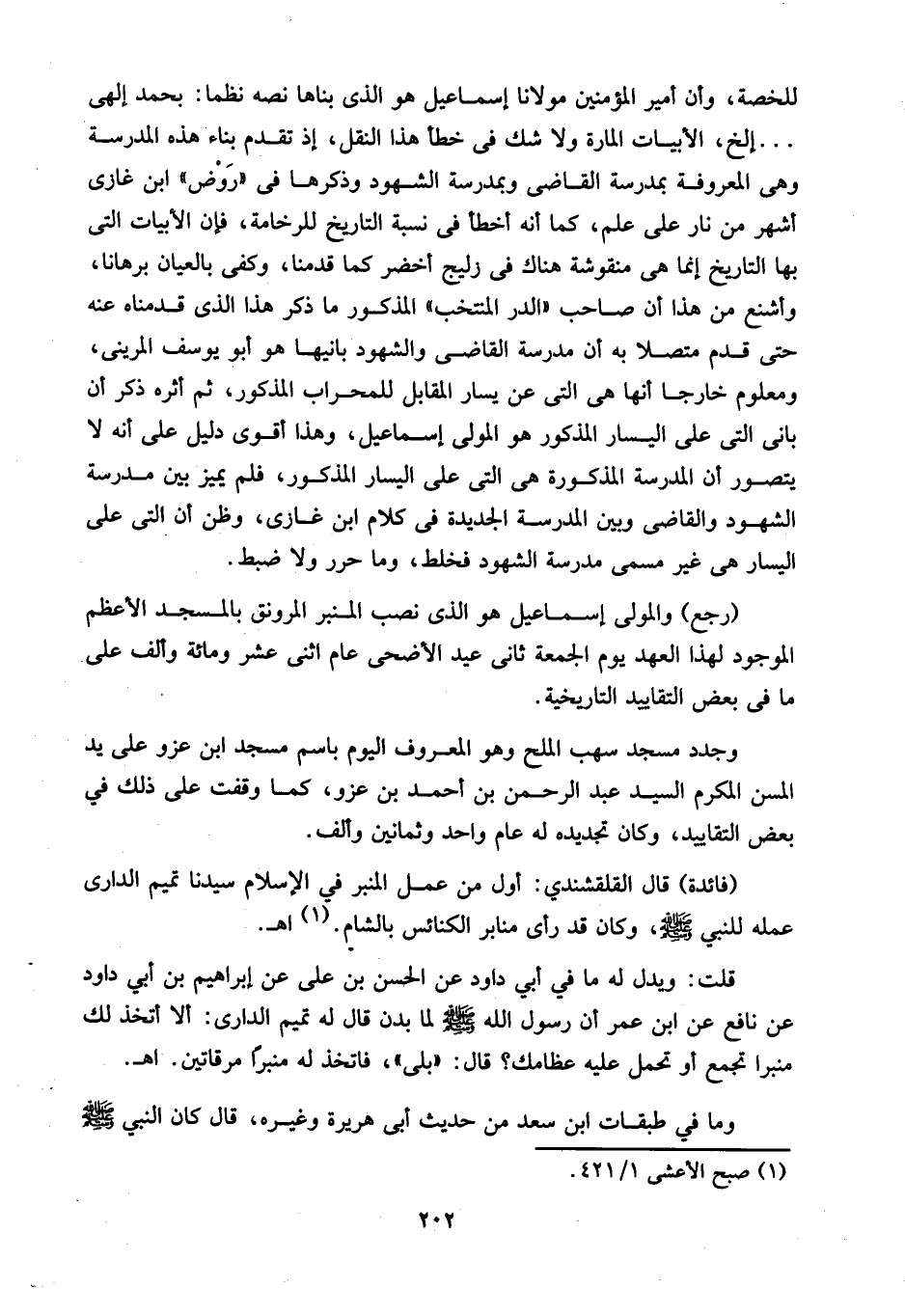 (رجع) والمولى إسماعيل هو الذى نصب المنبر المرونق بالمسجد الأعظم الموجود لهذا العهد يوم الجمعة ثانى عيد الأضحى عام اثنى عشر ومائة وألف على ما في بعض التقاييد التاريخية.