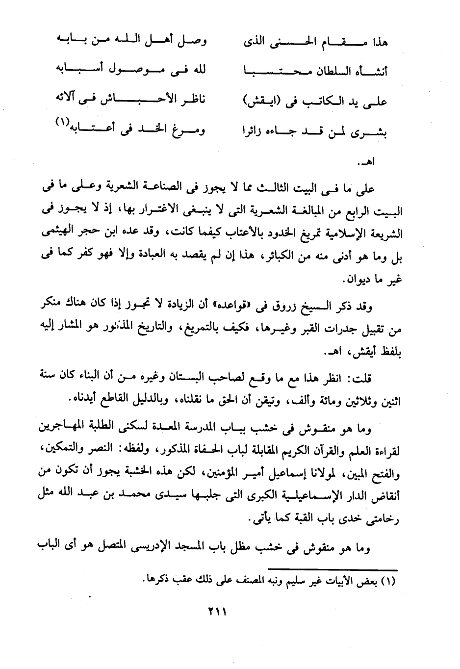 على ما في البيت الثالث مما لا يجور في الصناعة الشعرية وعلى ما في البيت الرابع من المبالغة الشعرية التي لا ينبغى الاغترار بها، إذ لا يجوز في الشريعة الإسلامية تمريغ الخدود بالأعتاب كيفما كانت، وقد عده ابن حجر الهيثمى بل وما هو أدنى منه من الكبائر، هذا إن لم يقصد به العبادة وإلا فهو كفر كما في غير ما ديوان.
