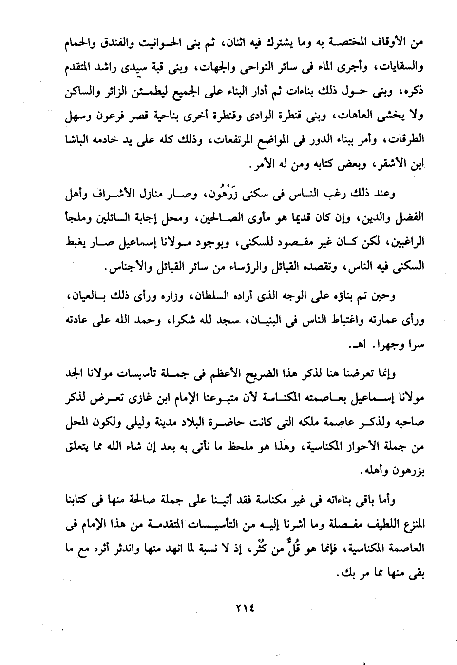 وإنما تعرضنا هنا لذكر هذا الضريح الأعظم في جملة تأسيسات مولانا الجد مولانا إسماعيل بعاصمته المكناسة لأن متبوعنا الإمام ابن غازى تعرض لذكر صاحبه ولذكر عاصمة ملكه التي كانت حاضرة البلاد مدينة وليلى ولكون المحل من جملة الأحواز المكناسية، وهذا هو ملحظ ما نأتى به بعد إن شاء الله مما يتعلق بزرهون وأهله.
