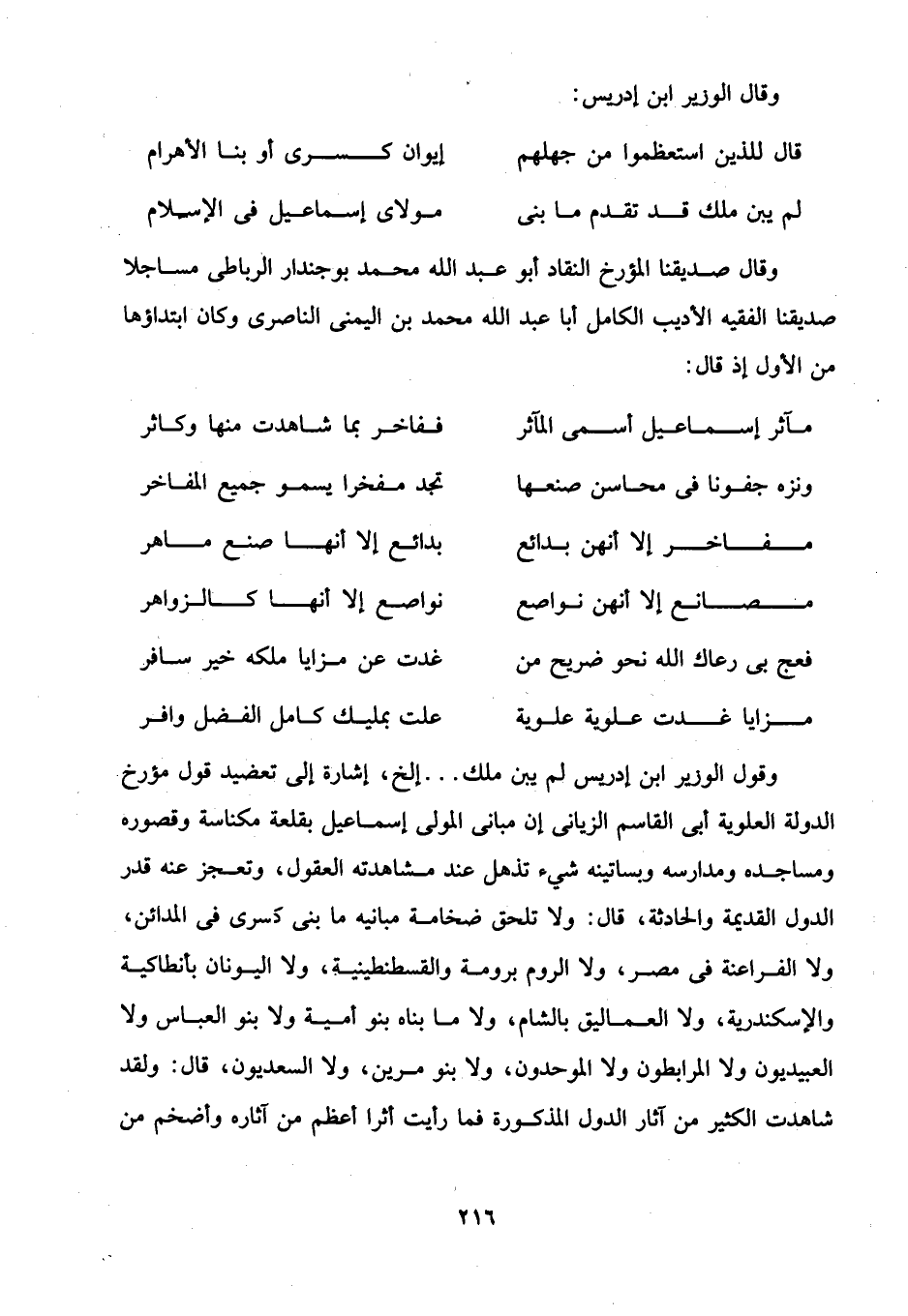وقول الوزير ابن إدريس لم يبن ملك ... إلخ، إشارة إلى تعضيد قول مؤرخ الدولة العلوية أبى القاسم الزيانى إن مبانى المولى إسماعيل بقلعة مكناسة وقصوره ومساجده ومدارسه وبساتينه شيء تذهل عند مشاهدته العقول، وتعجز عنه قدر الدول القديمة والحادثة، قال: ولا تلحق ضخامة مبانيه ما بنى كسرى في المدائن، ولا الفراعنة في مصر، ولا الروم برومة والقسطنطينية، ولا اليونان بأنطاكية والإسكندرية، ولا العماليق بالشام، ولا ما بناه بنو أمية ولا بنو العباس ولا العبيديون ولا المرابطون ولا الموحدون، ولا بنو مرين، ولا السعديون، قال: ولقد شاهدت الكثير من آثار الدول المذكورة فما رأيت أثرا أعظم من آثاره وأضخم من