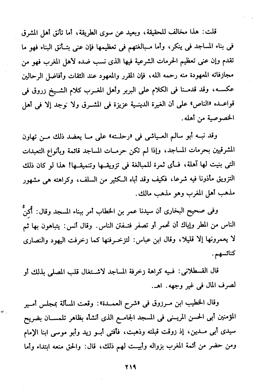 وقد نبه أبو سالم العياشى في "رحلته" على ما يعضد ذلك من تهاون المشرقيين بحرمات المساجد، وإذا لم تكن حرمات المساجد قائمة وبأنواع التعبدات التي بنيت لها آهلة، فأى ثمرة للمبالغة في تزويقها وتنميقها! هذا لو كان ذلك التزويق مأذونا فيه شرعا، فكيف وقد أباه الكثير من السلف، وكراهته هى مشهور مذهب أهل المغرب وهو مذهب مالك.