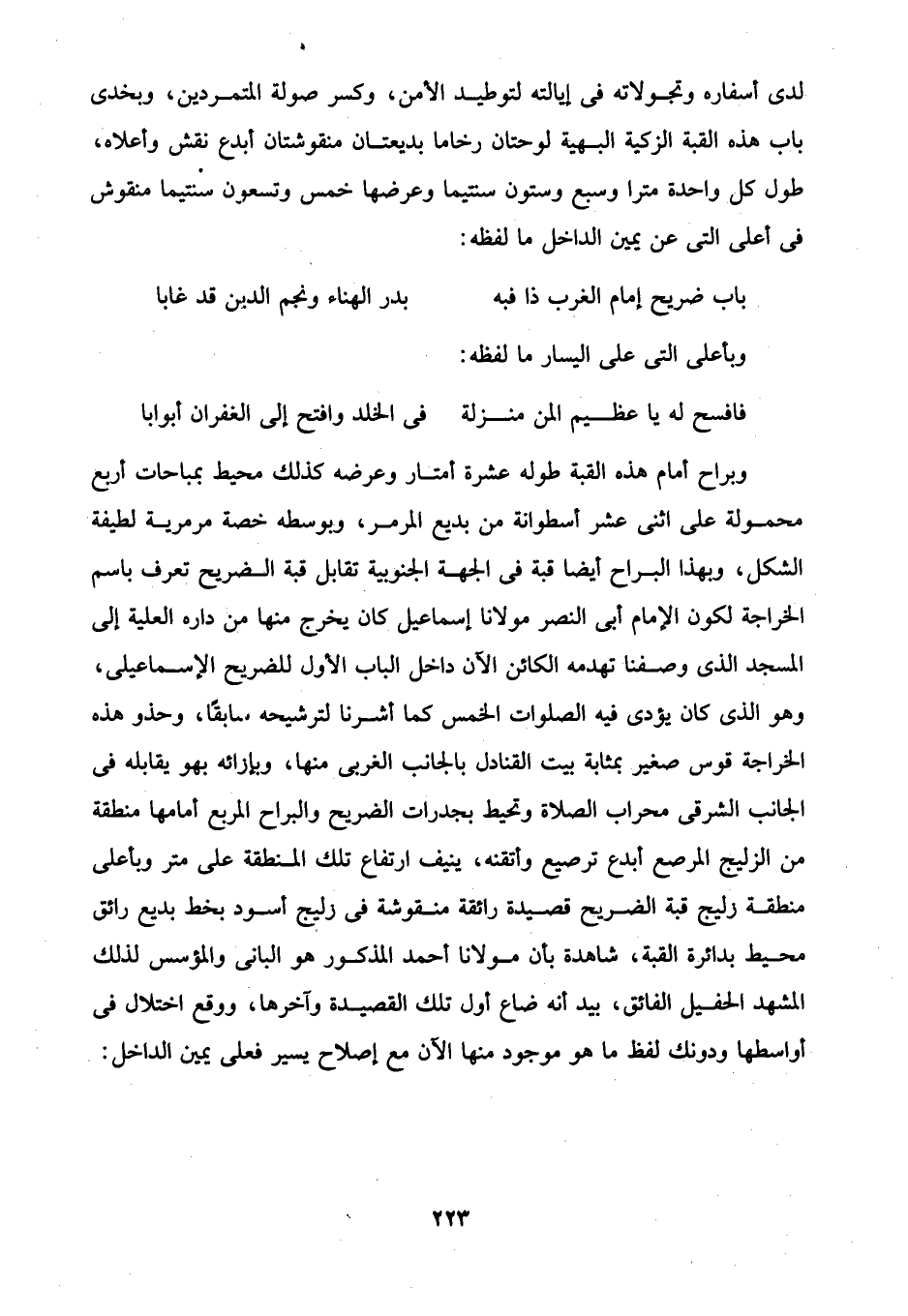 وبراح أمام هذه القبة طوله عشرة أمتار وعرضه كذلك محيط بمباحات أربع محمولة على اثنى عشر أسطوانة من بديع المرمر، وبوسطه خصة مرمرية لطيفة الشكل، وبهذا البراح أيضا قبة في الجهة الجنوبية تقابل قبة الضريح تعرف باسم الخراجة لكون الأمام أبى النصر مولانا إسماعيل كان يخرج منها من داره العلية إلى المسجد الذى وصفنا تهدمه الكائن الآن داخل الباب الأول للضريح الإسماعيلى، وهو الذى كان يؤدى فيه الصلوات الخمس كما أشرنا لترشيحه سابقًا، وحذو هذه الخراجة قوس صغير بمثابة بيت القنادل بالجانب الغربى منها، وبإزائه بهو يقابله في الجانب الشرقى محراب الصلاة وتحيط بجدرات الضريح والبراح المربع أمامها منطقة من الزليج المرصع أبدع ترصيع وأتقنه، ينيف ارتفاع تلك المنطقة على متر وبأعلى منطقة زليج قبة الضريح قصيدة رائقة منقوشة في زليج أسود بخط بديع رائق محيط بدائرة القبة، شاهدة بأن مولانا أحمد المذكور هو البانى والمؤسس لذلك المشهد الحفيل الفائق، بيد أنه ضاع أول تلك القصيدة وآخرها، ووقع اختلال في أواسطها ودونك لفظ ما هو موجود منها الآن مع إصلاح يسير فعلى يمين الداخل: