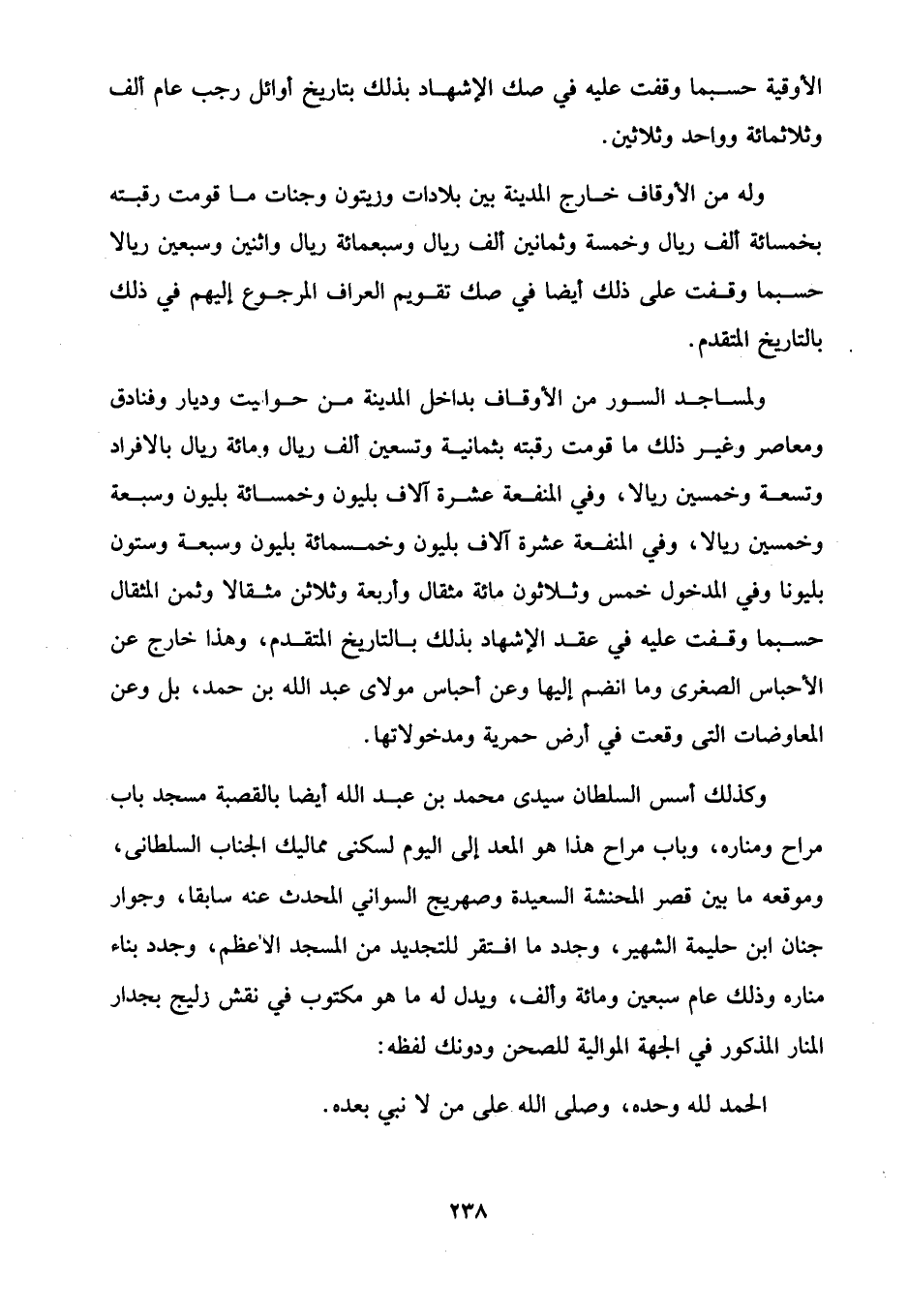 ولمساجد السور من الأوقاف بداخل المدينة من حواديت وديار وفنادق ومعاصر وغير ذلك ما قومت رقبته بثمانية وتسعين ألف ريال 9 مائة ريال بالإفراد وتسعة وخمسين ريالا، وفي المنفعة عشرة آلاف بليون وخمسائة بليون وسبعة وخمسين ريالا، وفي المنفعة عشرة آلاف بليون وخمسمائة بليون وسبعة وستون بليونا وفي المدخول خمس وثلاثون مائة مثقال وأربعة وثلاثين مثقالا وثمن المثقال حسبما وقفت عليه في عقد الإشهاد بذلك بالتاريخ المتقدم، وهذا خارج عن الأحباس الصغرى وما انضم إليها وعن أحباس مولاى عبد الله بن حمد، بل وعن المعاوضات التي وقعت في أرض حمرية ومدخولاتها.