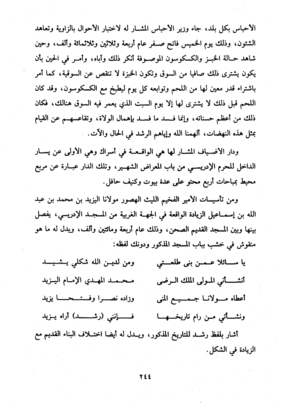 ومن تأسيسات الأمير الفخيم الليث الهصور مولانا اليزيد بن محمد بن عبد الله بن إسماعيل الزيادة الواقعة في الجهة الغربية من المسجد الإدريسي، يفصل بينها وبين المسجد القديم الصحن، وذلك عام أربعة ومائتين وألف، ويدل له ما هو منقوش في خشب بباب المسجد المذكور ودونك لفظه:
